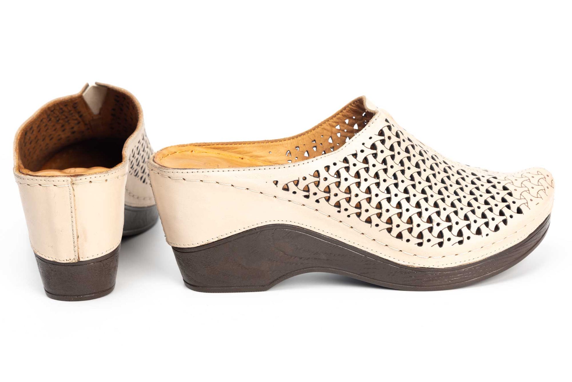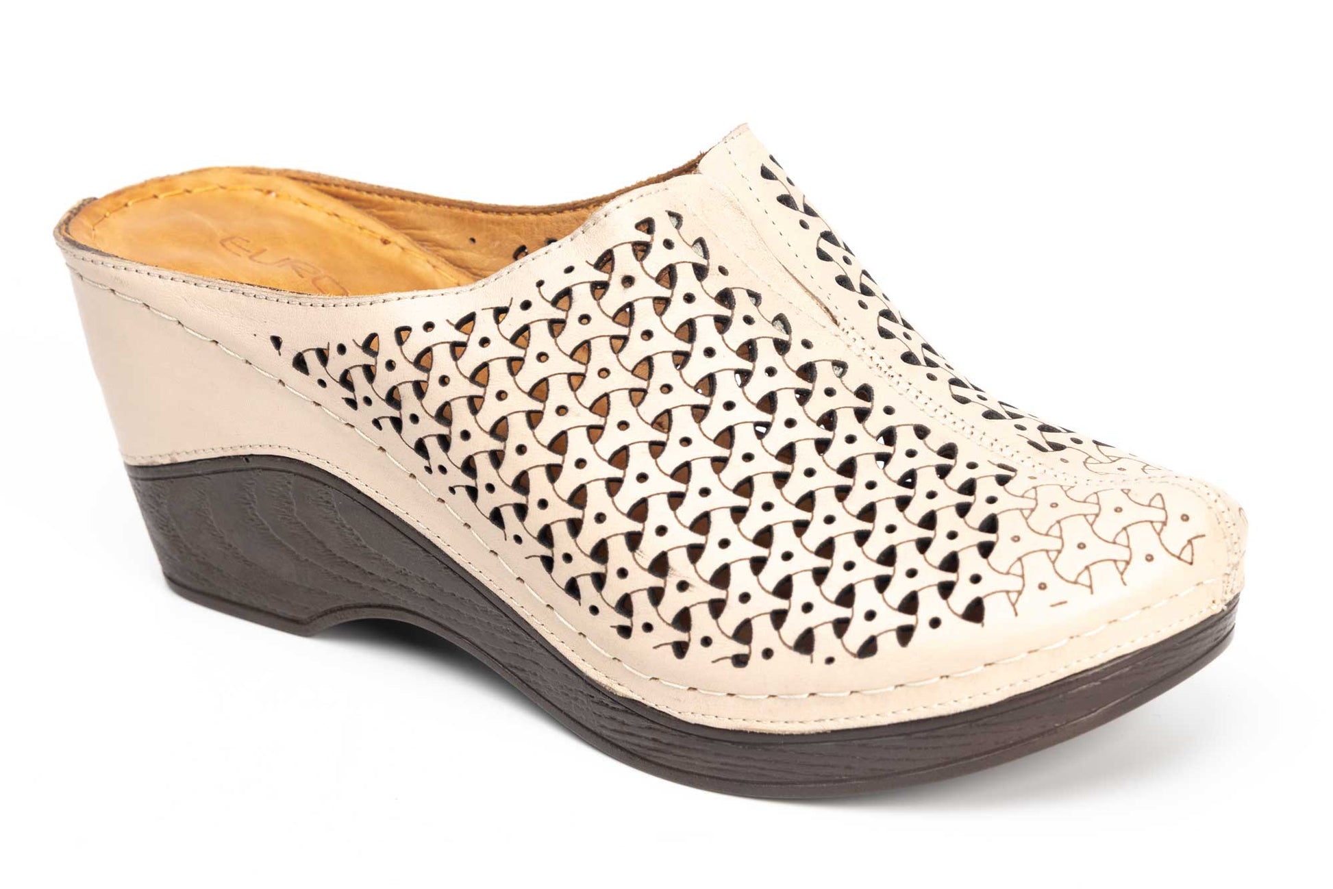 Saboti dama LSD din piele naturala perforati avand o talpa ortopedica cu inaltimea de 6 cm cusuti pe margini ofera maximum de confort la purtarea lor atat in interior cat si exterior. Greutatea unui singur sabot este 190 grame.