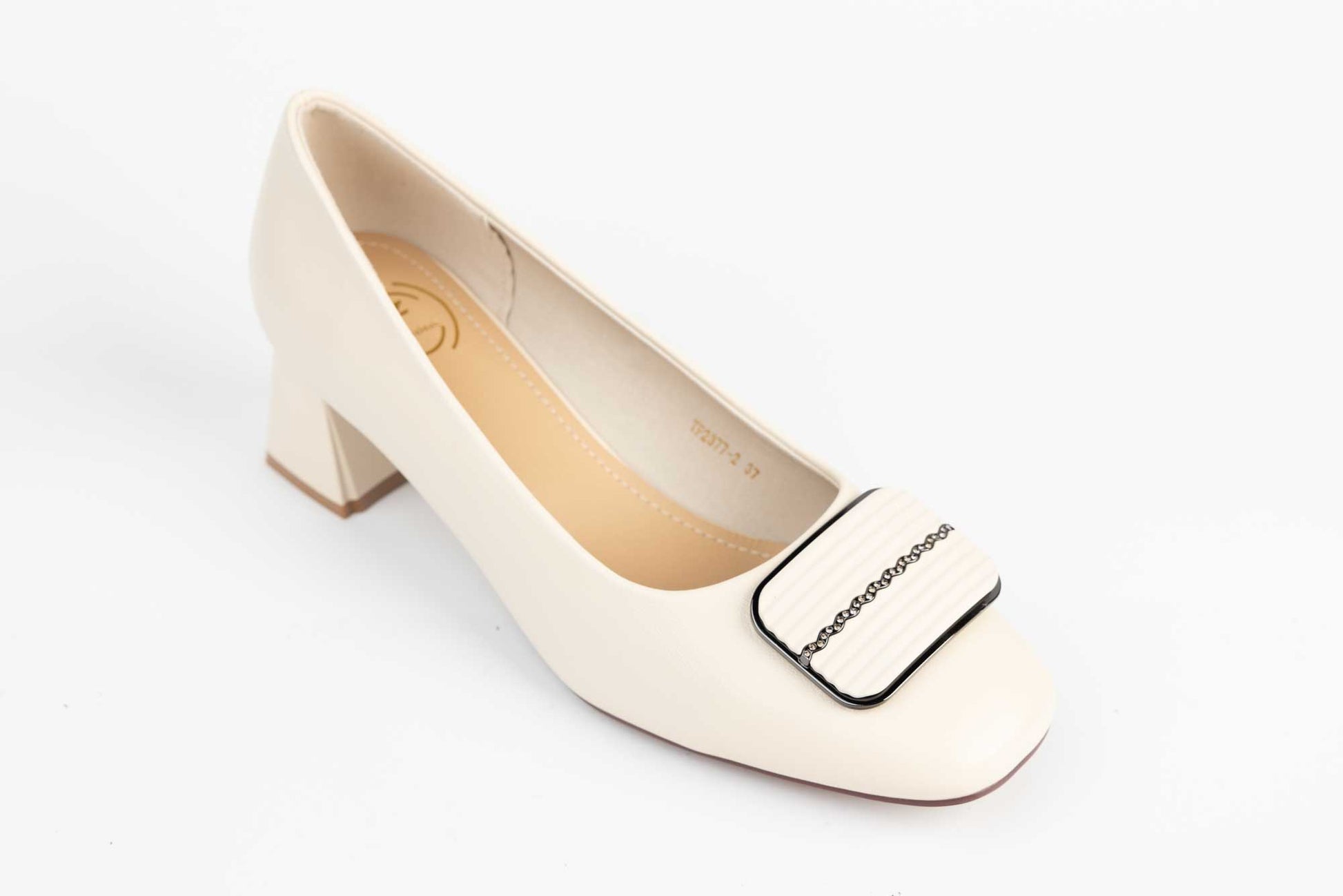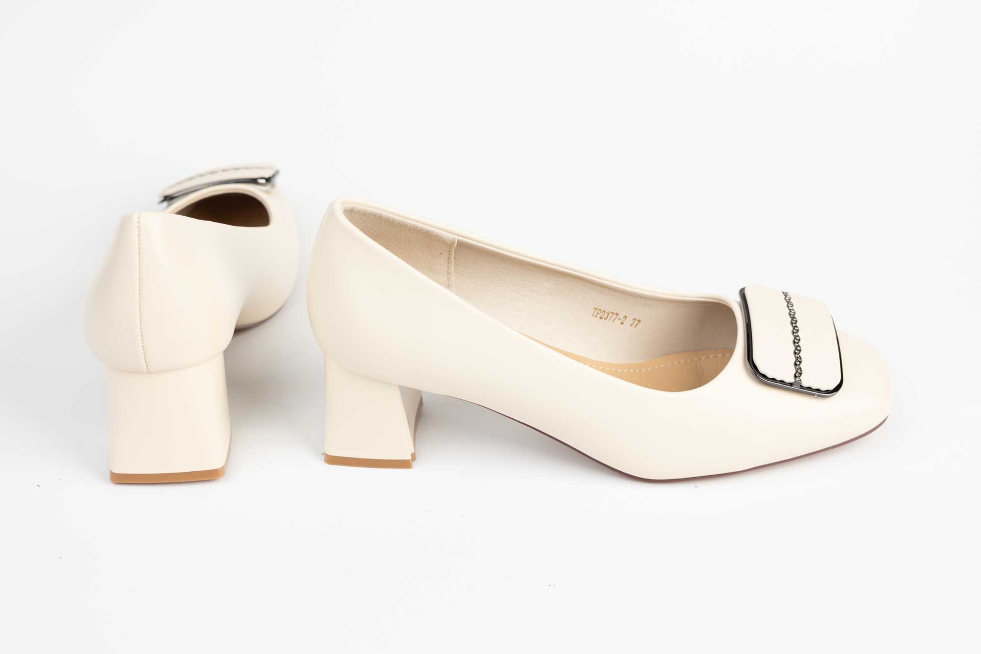 Pantofi FORMAZIONE de dama din piele naturala cu toc patrat de 5 cm inaltime simpli. Pielea este foarte moale si ofera maximum de confort la purtare indelungata, Talpa este usoara, flexibila iar pe interior detine un brant cu memory. Pe varful pantofului este montat un accesoriu metalic cu insertie de cristale finute.