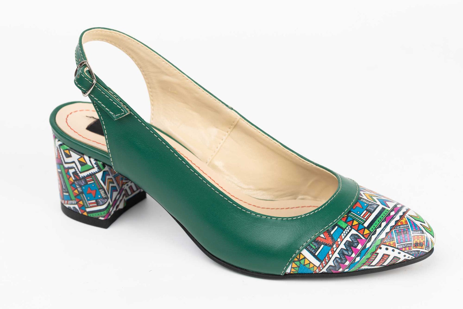 Pantofi SORTEC de dama piele naturala decupati la spate cu prindere intr-o bareta subtire cu o catarama finuta avand tocul patrat imbracat in piele cu motive. Tocul are inaltimea de 6 cm facand din acest model unul foarte comod si stabil.