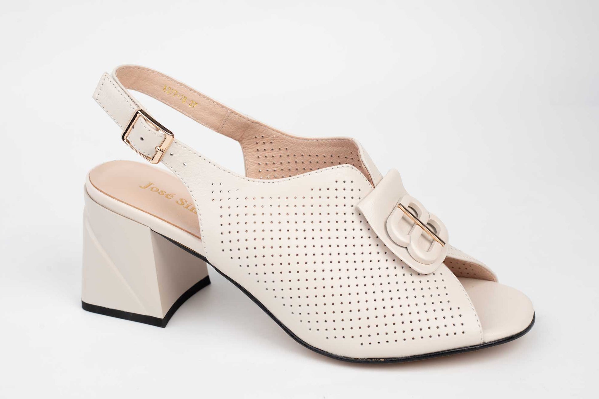 Sandale JOSE SIMON de dama din piele naturala decupat la varf si in spate iar tocul este patrat gros de 6 cm inaltime cu varful rotund. Greutatea unui singur picior este de 225 grame. Pe varful pantofului este aplicat un accesoriu din piele naturala cu o sigla metalica aurie in ton cu catarama de prindere..