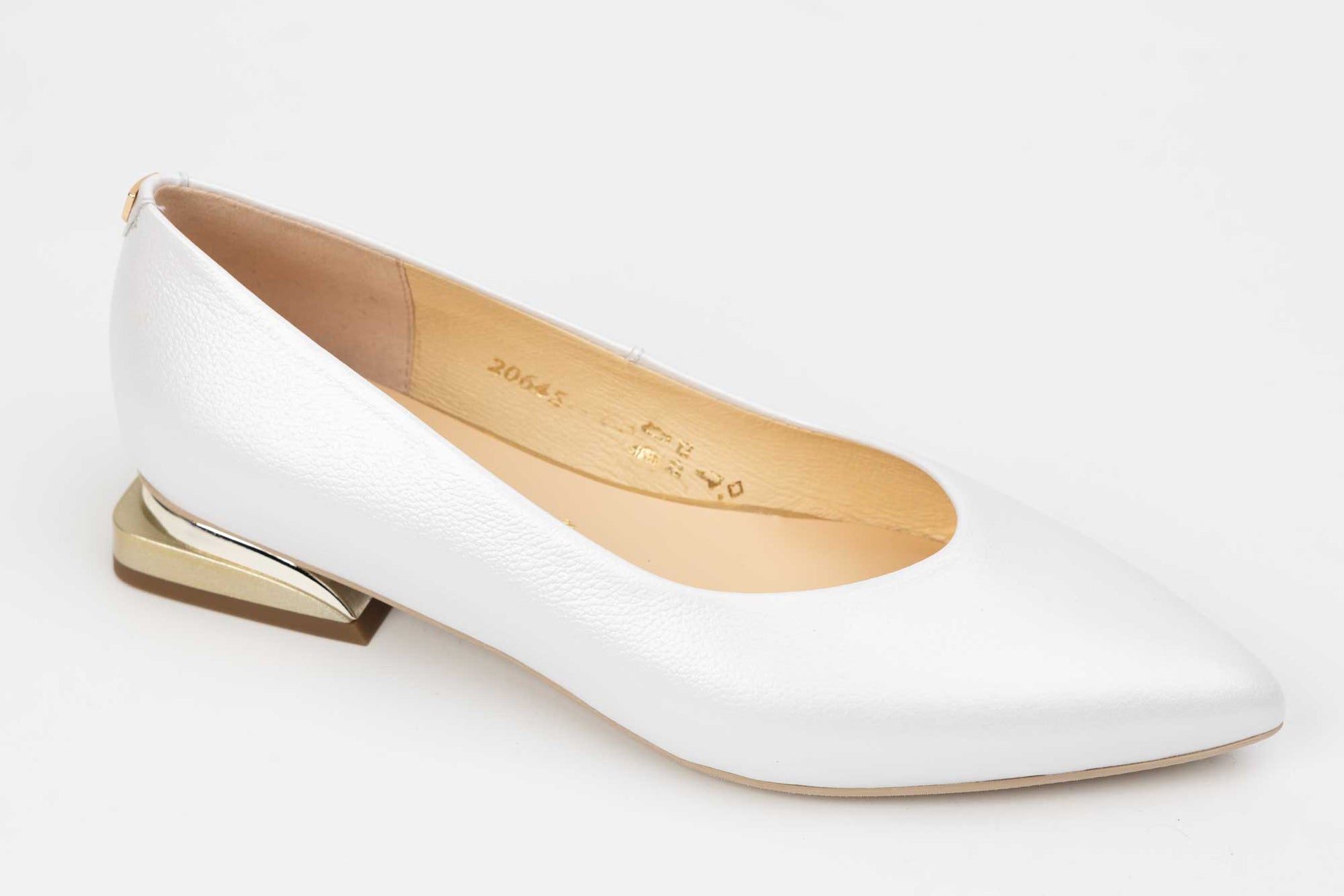Pantofi mireasa SALA cu toc jos patrat cu inserție aurie,model clasic si simplu confectionat din piele naturala de vitel moale la atingere, ofera un confort sporit datorita calapodului testat. Usor de purtat , acest model are inaltimea tocului de 1 cm.