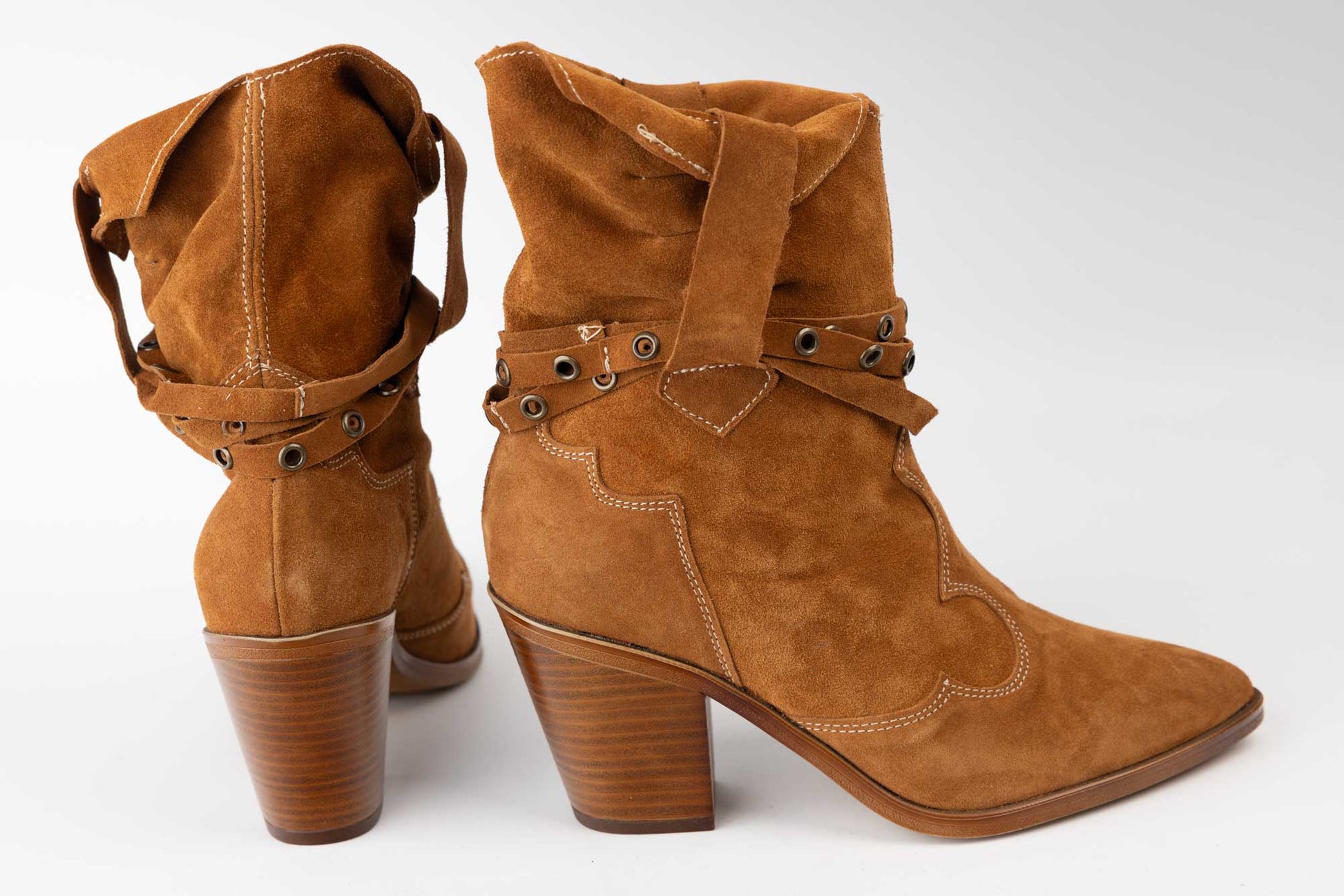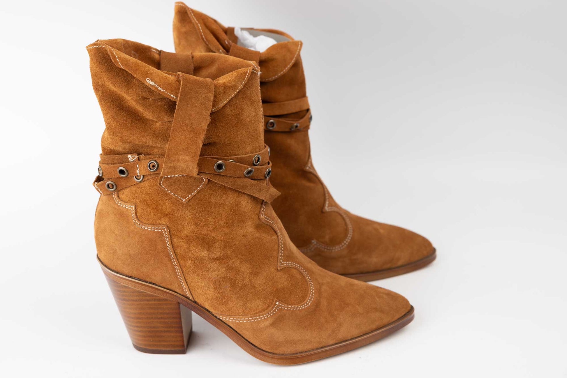 Ghete PERLA de dama din piele intoarsa naturala fără fermoar lateral,cu o curelusa la glezna si talpa cu toc gros de 7,5 cm cu varful ascutit,comode si usoare. Greutatea unui singur picior este de 340 grame.