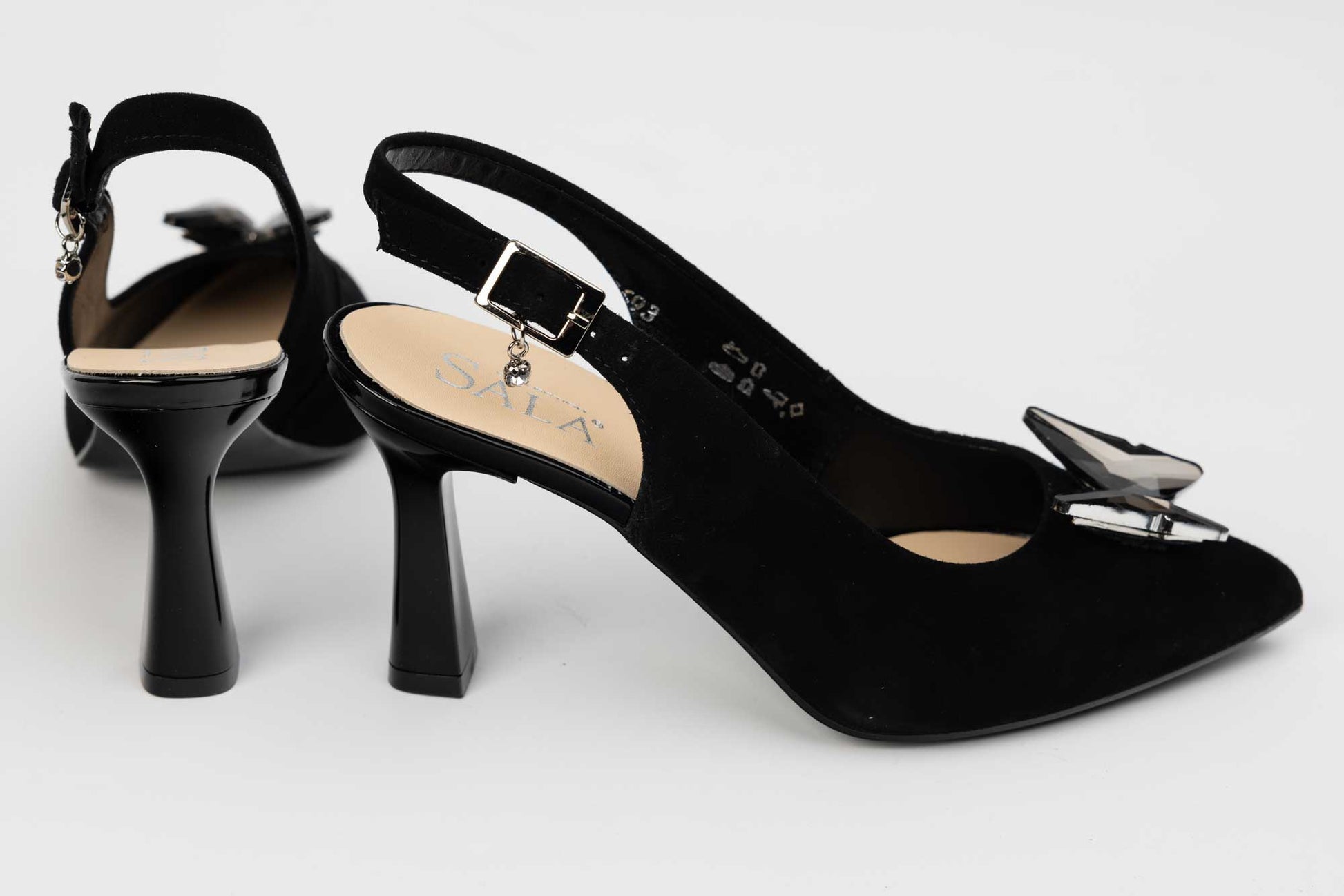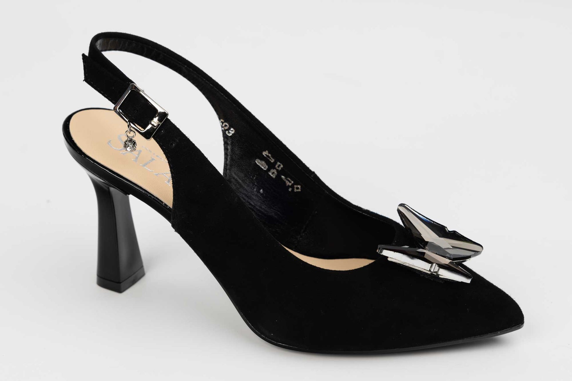 Pantof SALA cu toc mediu evazat,model clasic si simplu confectionat din piele naturala de vitel moale la atingere, ofera un confort sporit datorita calapodului testat si tocului usor de purtat (7,5 cm). Acest model are in zona calcaiului o bareta cu prindere într-o catarama fina.