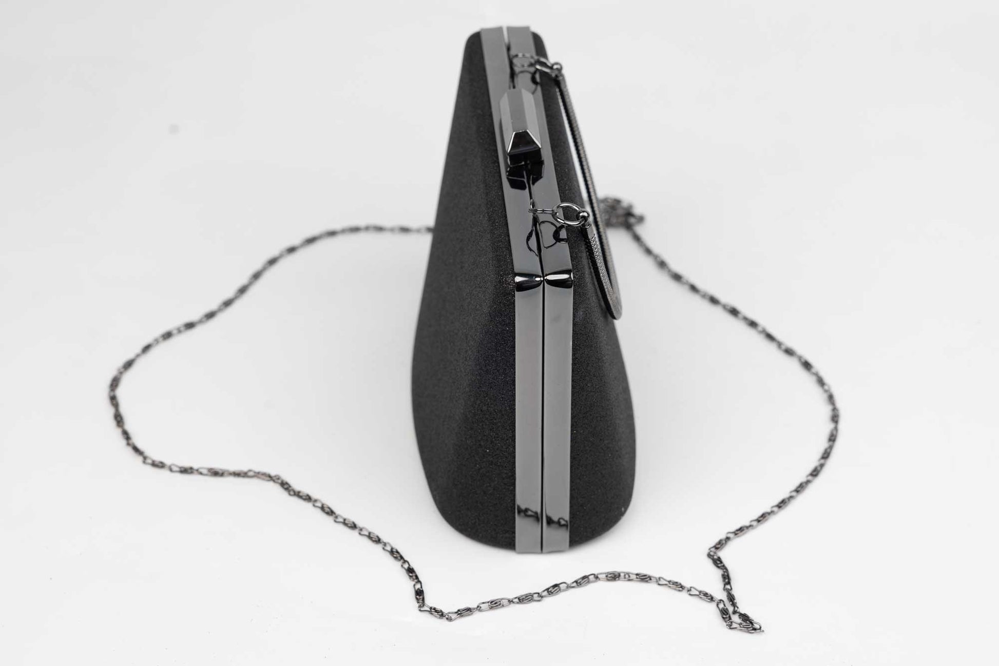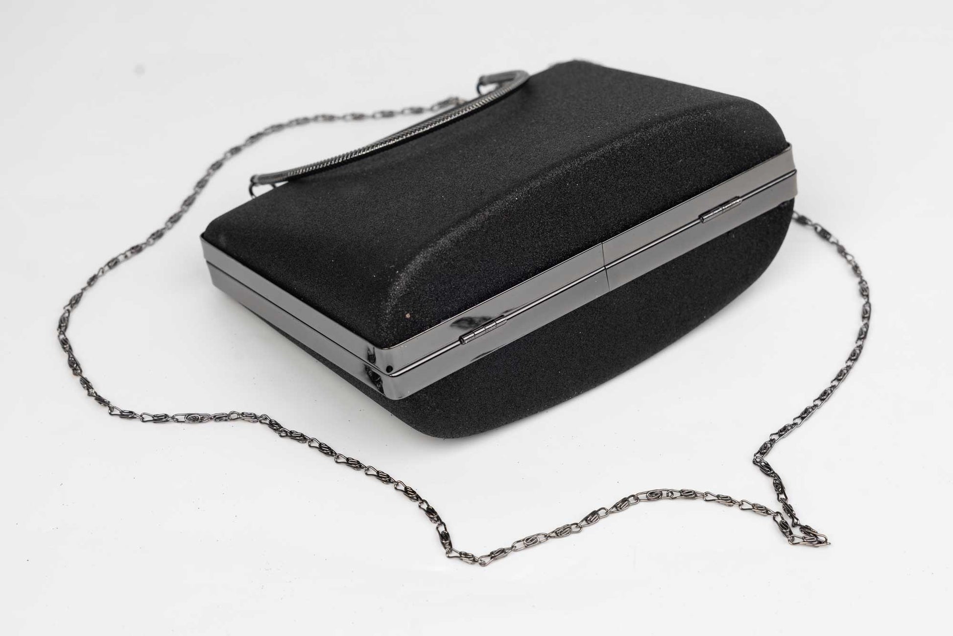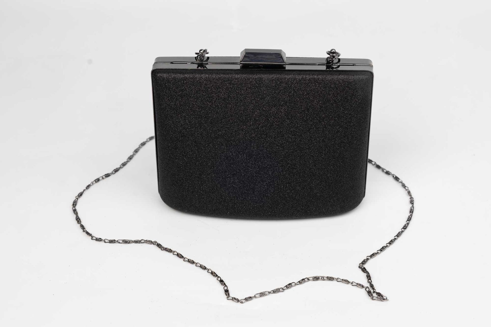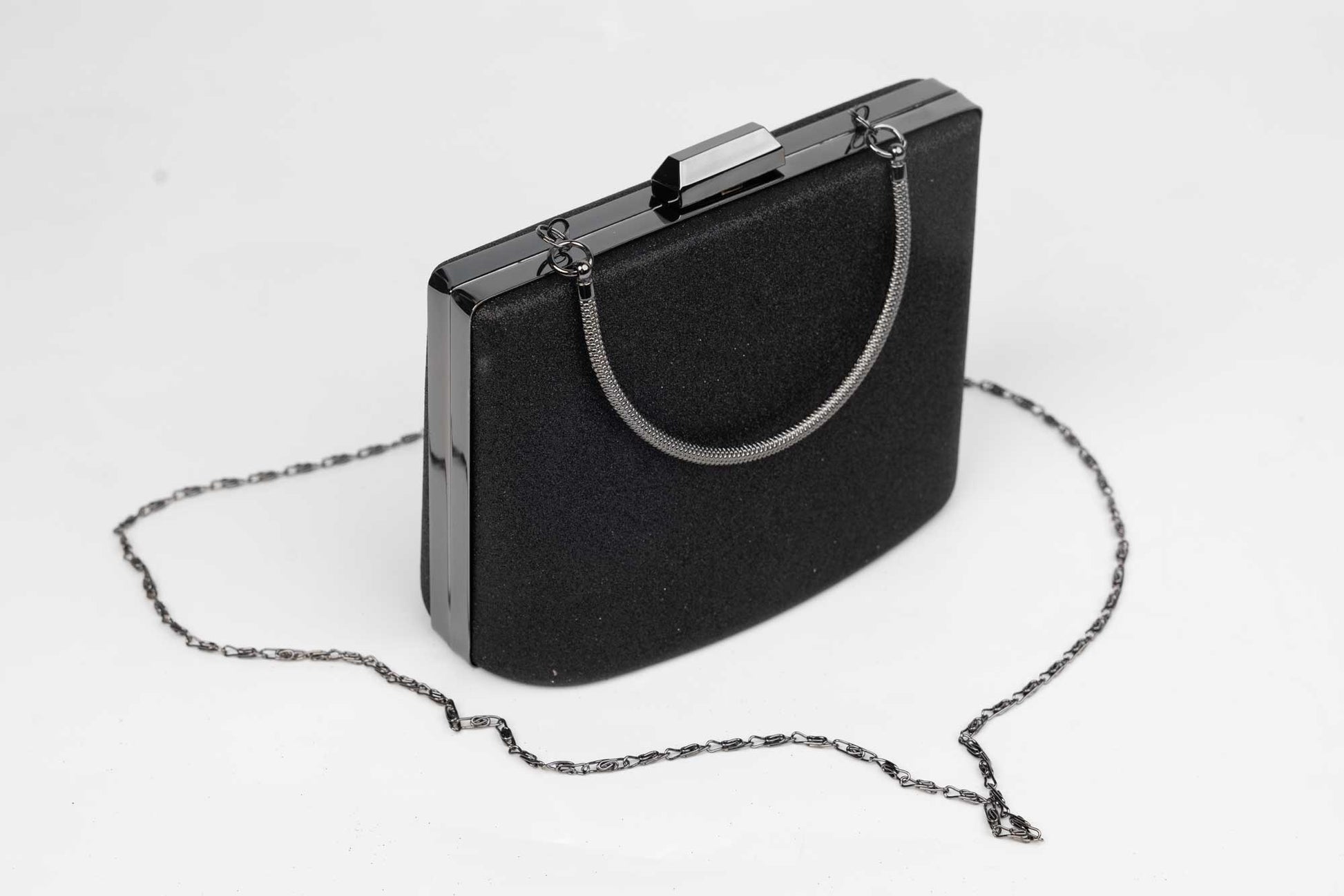 Un plic de dama de marime 18-13 cm cu efecte sclipitoare negre avand in dotare un maner dar si o curelusa lant metalice detasabile. Interiorul este unicameral si este potrivit si incapator pentru un telefon sau cosmetice. Inchiderea se face cu o clapeta metalica in partea de sus a plicului.