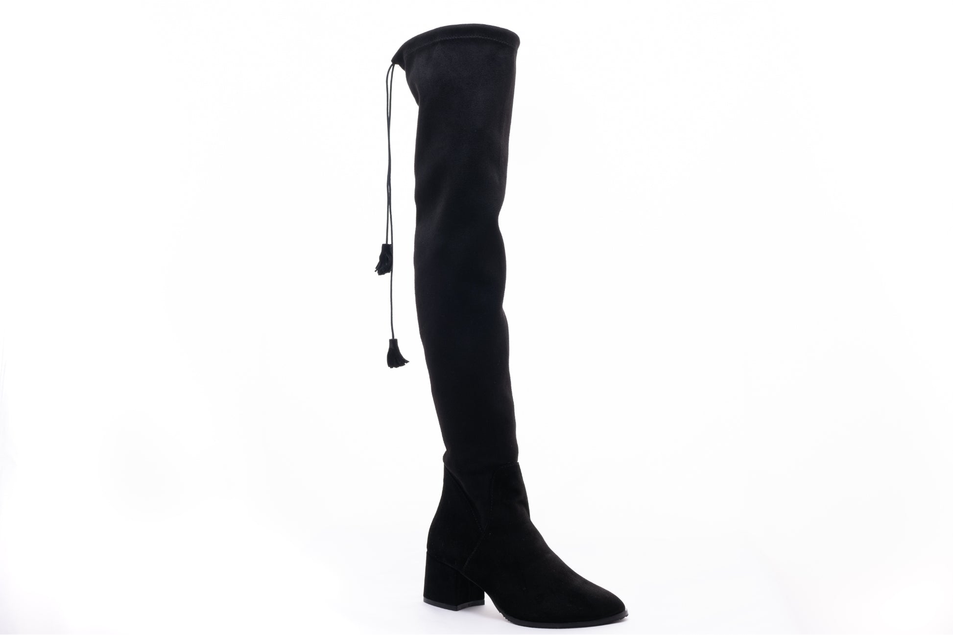 Cizme dama din strech elastic din velur cu toc patrat si cu fermoar lateral permitand sa treaca de nivelul genunchiului dipus cu un snur care se leaga la nevoie pentru fixare.