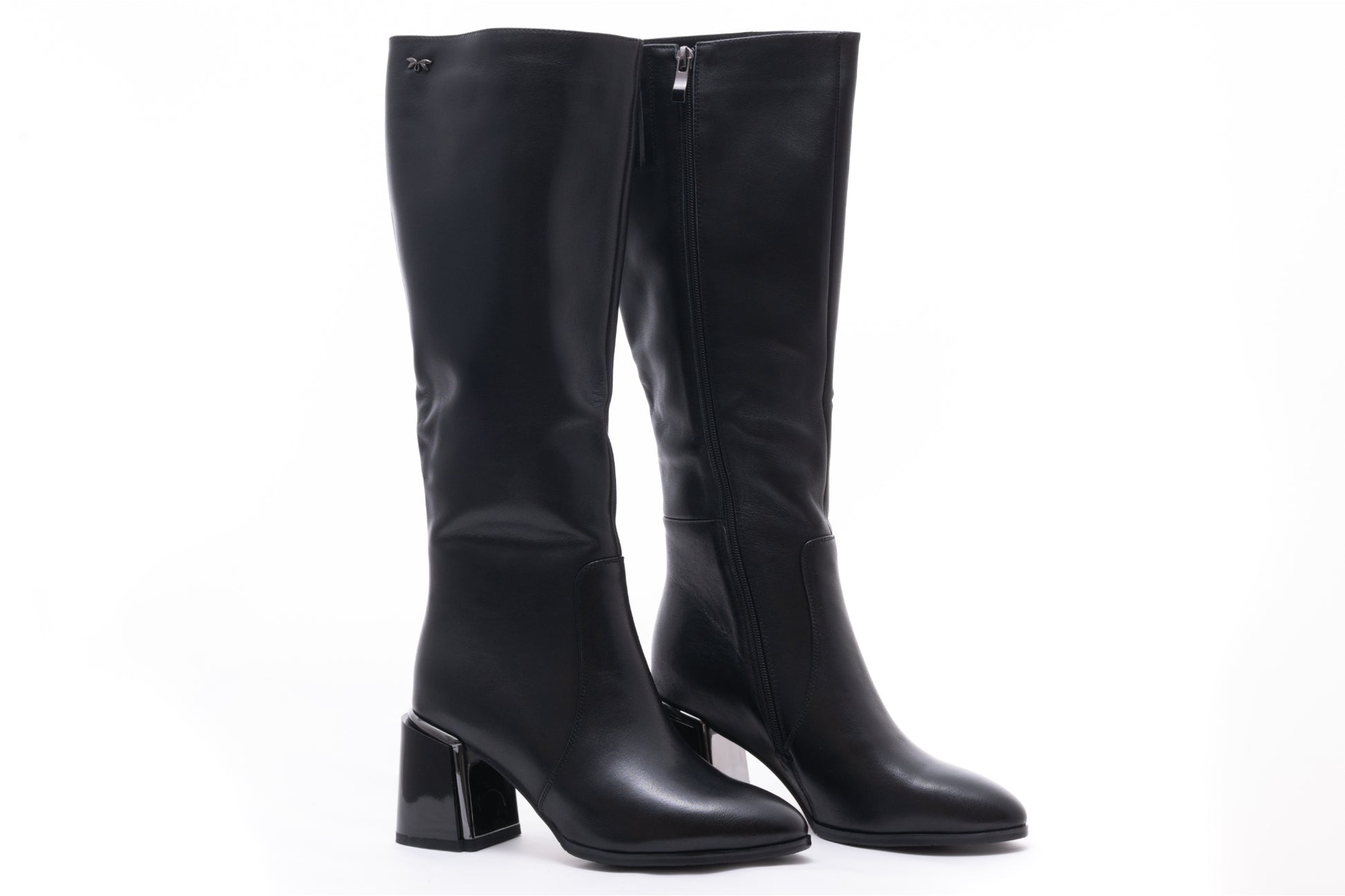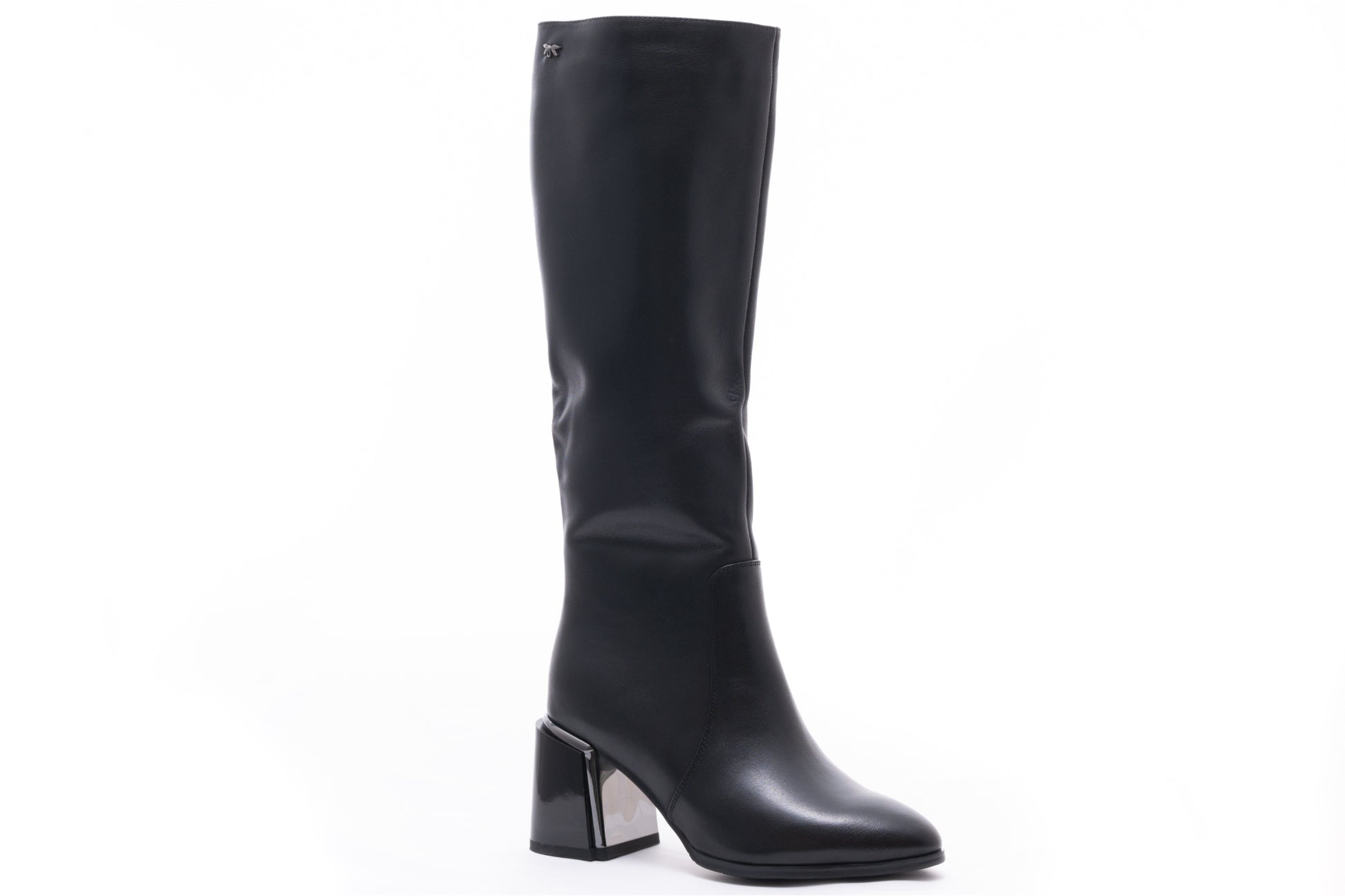 Cizme FEELING de dama din piele naturala imblanite pe interior cu toc patrat de 7 cm accesorizat cu un ornament metalic, are varful rotunjit si fermoar lateral.