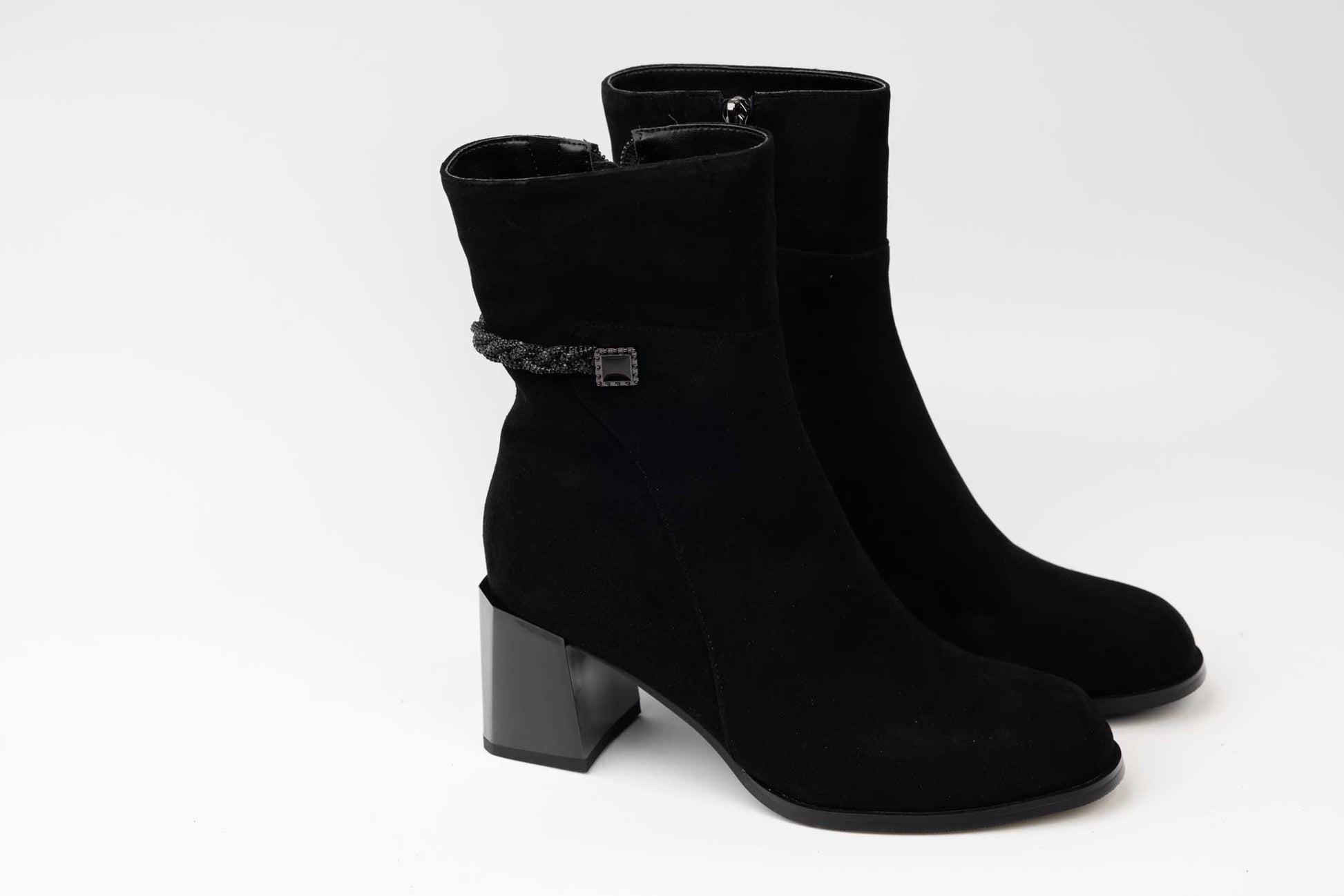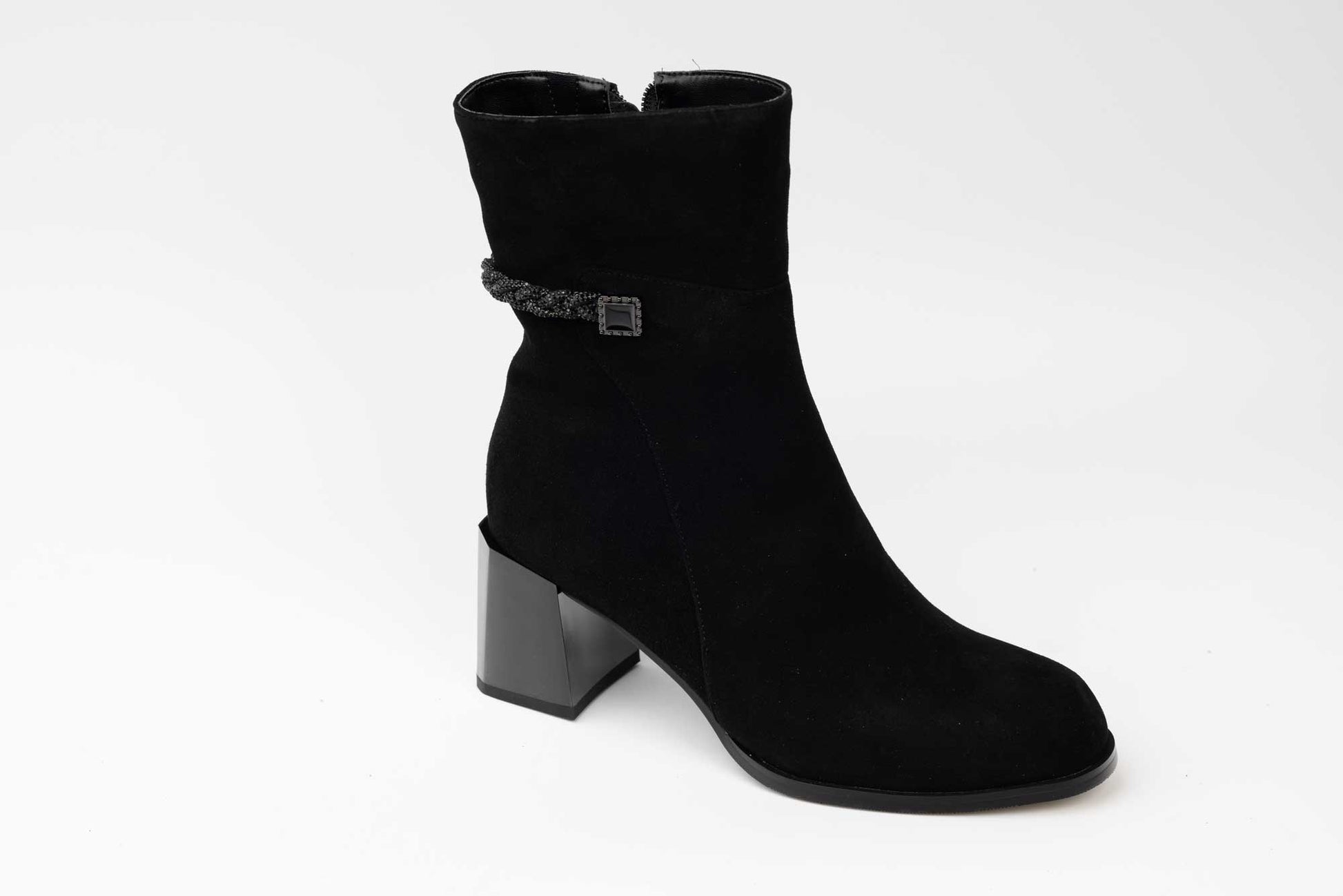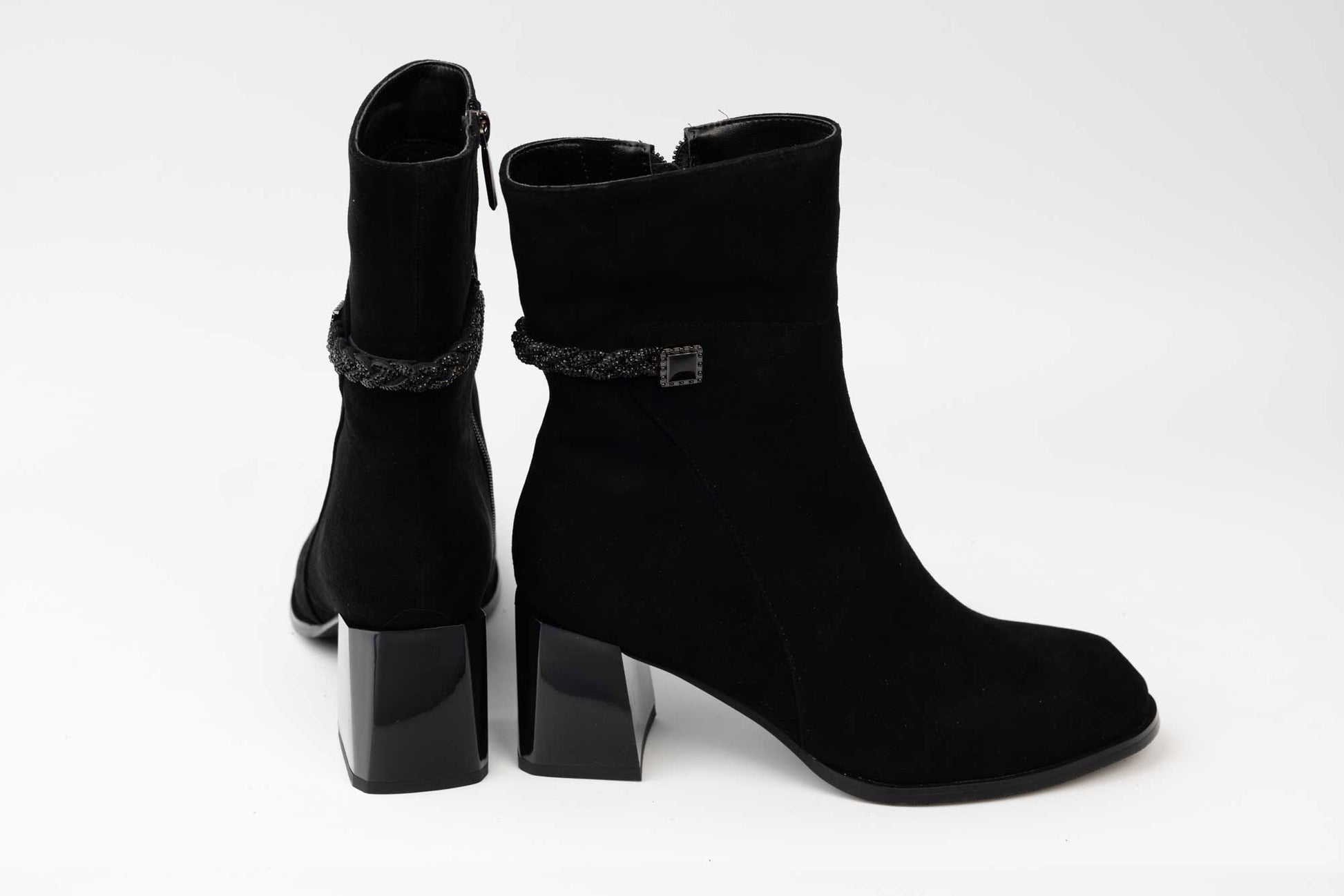 Ghete JOSE SIMON de dama din piele naturala intoarsa prevazuta cu fermoar lateral , blanita pe interior si un toc patrat vopsit negru lucios. Greutatea unei singure ghete este de 348 grame. Este accesorizat cu un snur impletit cu cristale negre.
