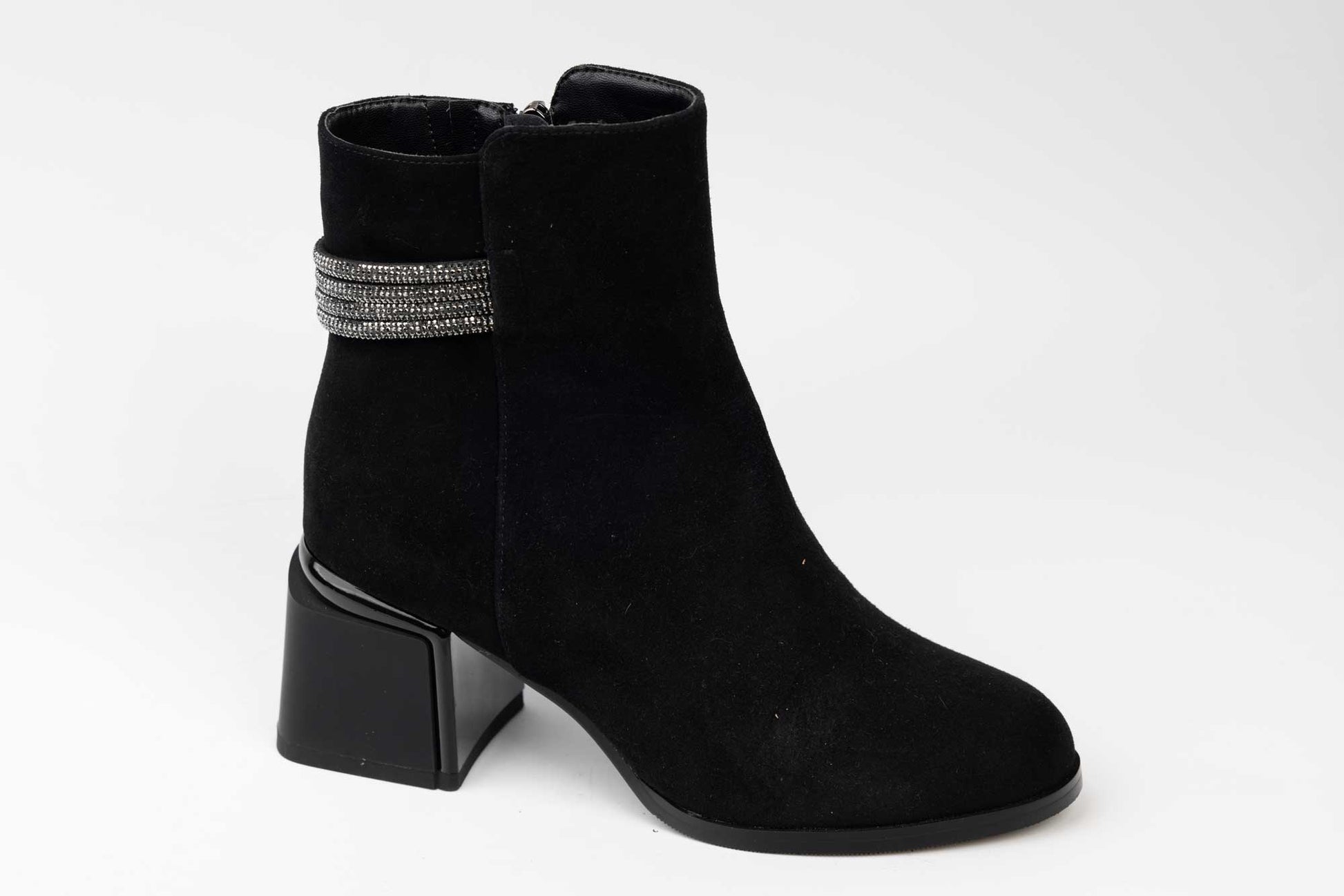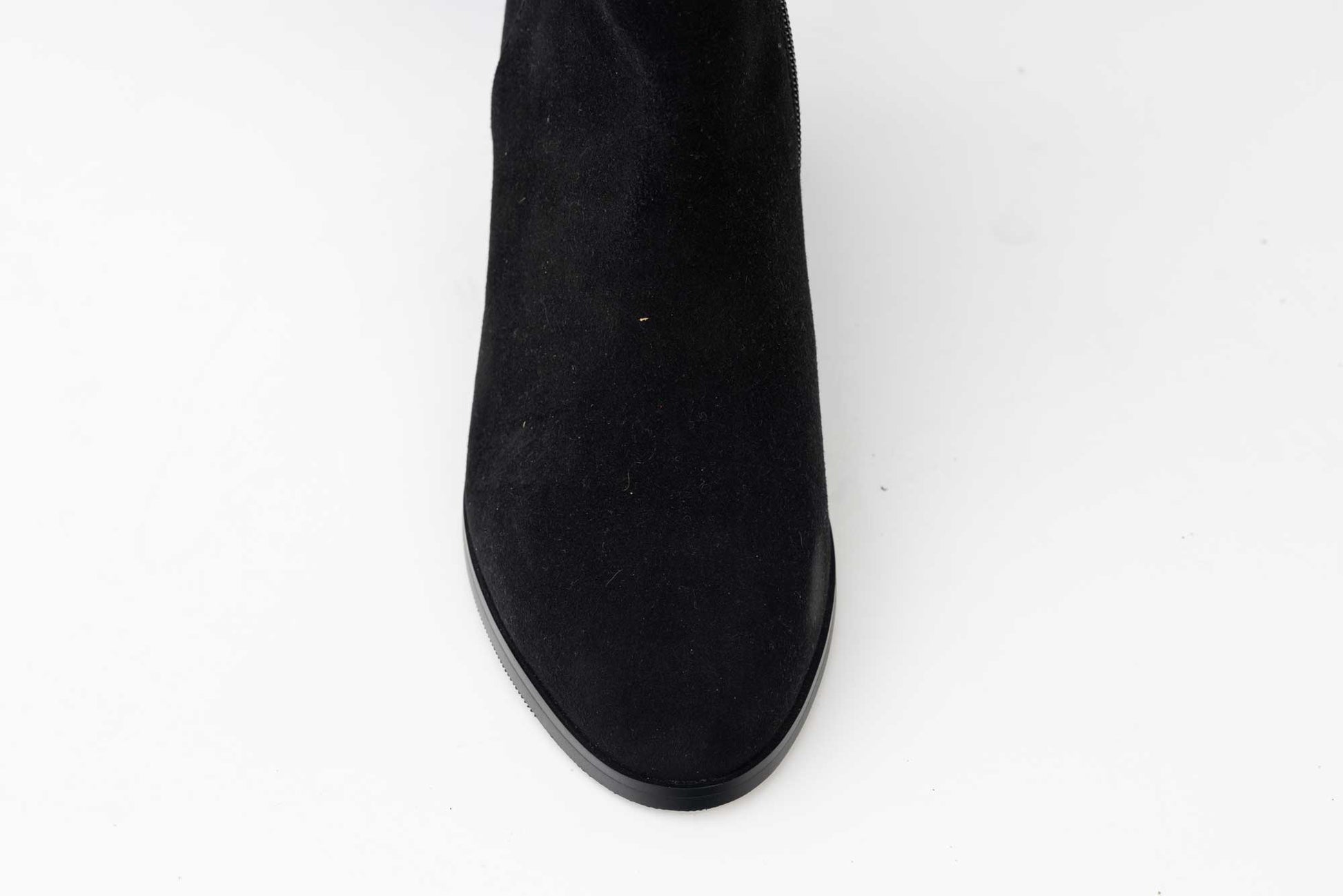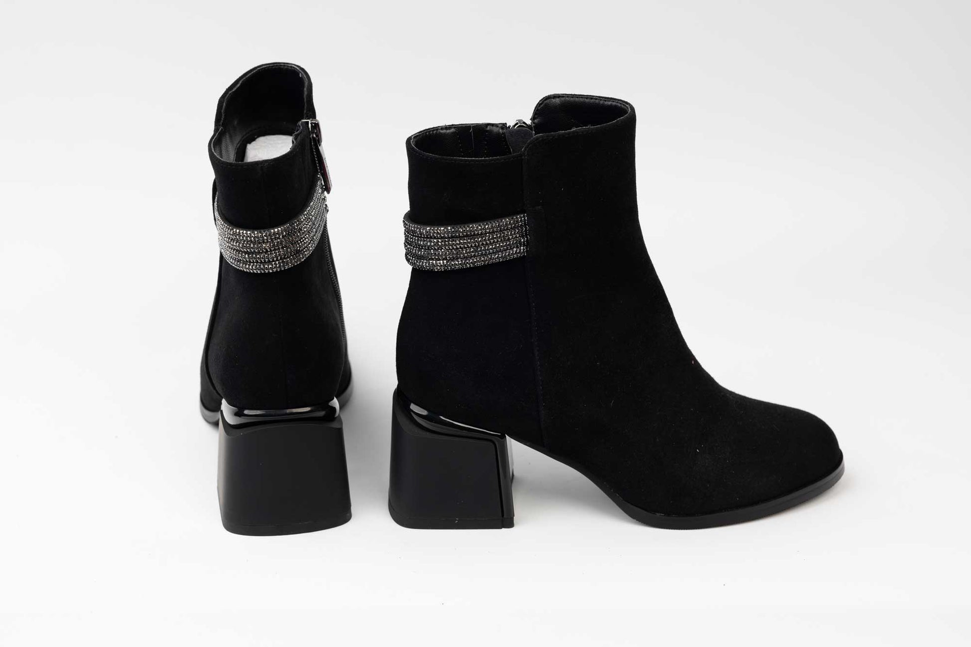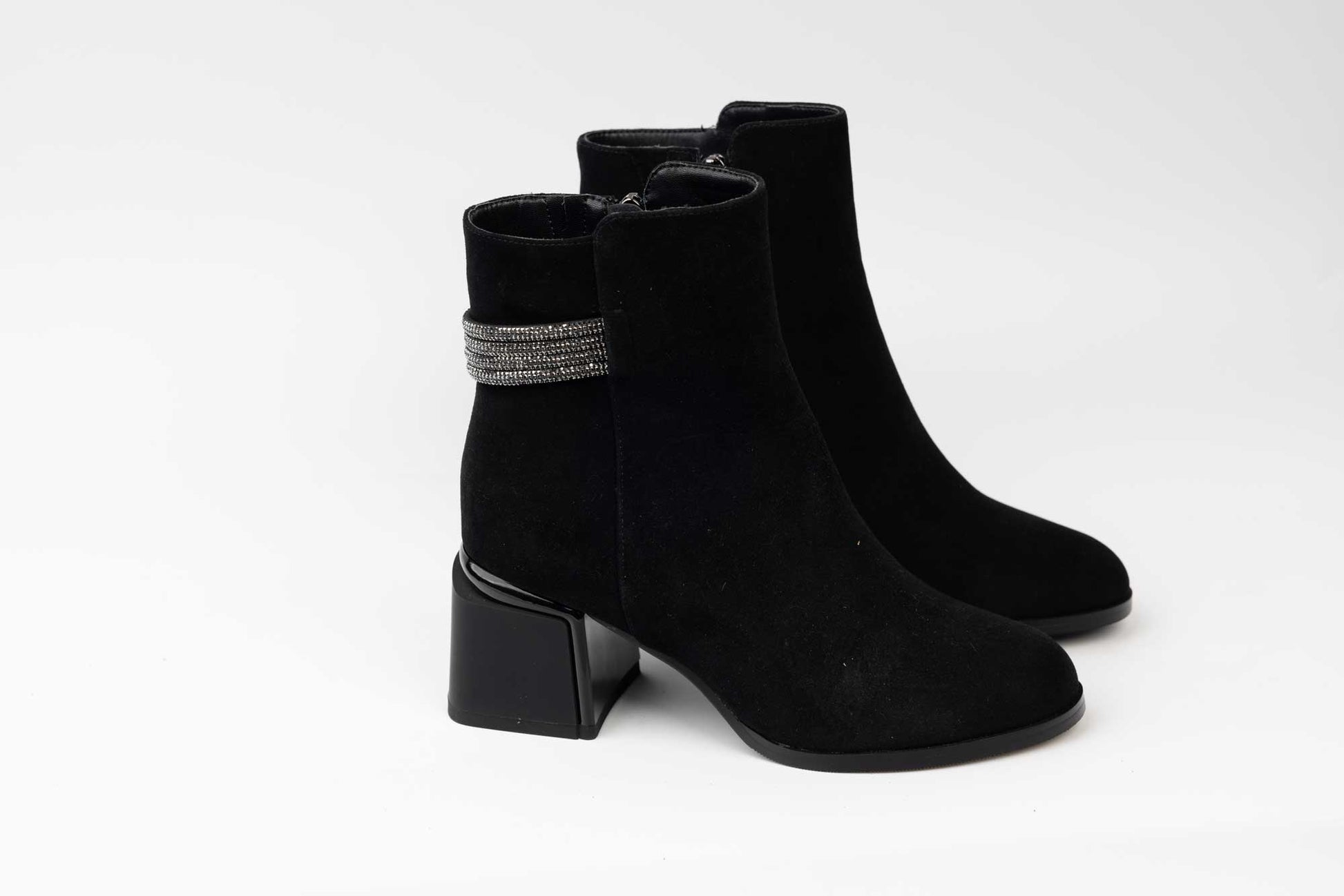 Ghete JOSE SIMON de dama din piele naturala intoarsa prevazuta cu fermoar lateral , blanita pe interior si un toc patrat accesorizat cu insertie decorativa negru lucios. Greutatea unei singure ghete este de 348 grame.