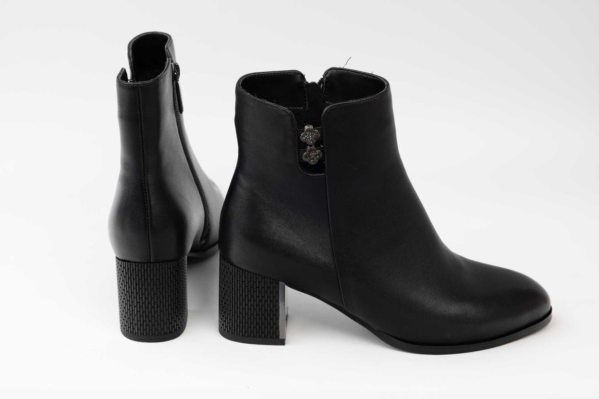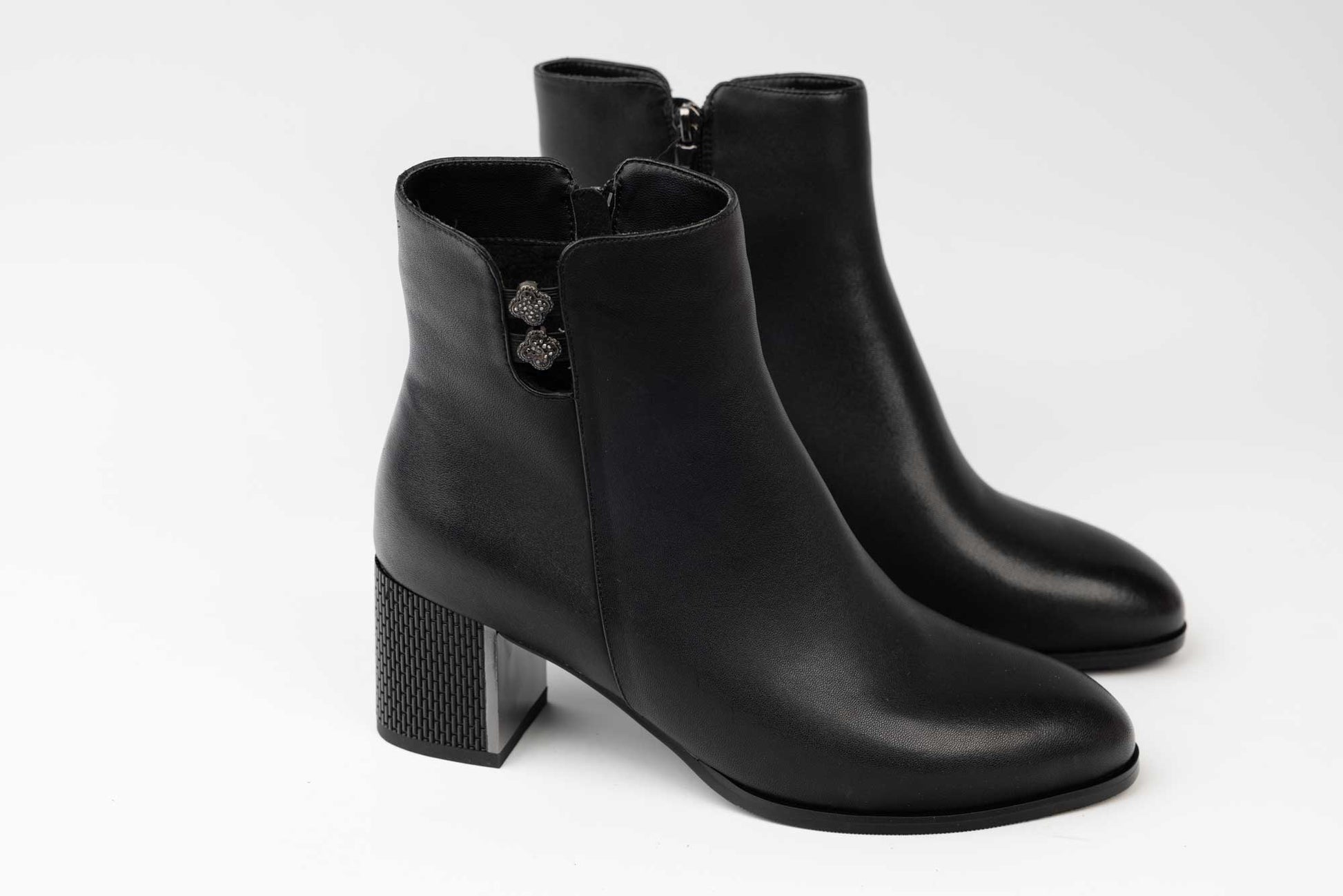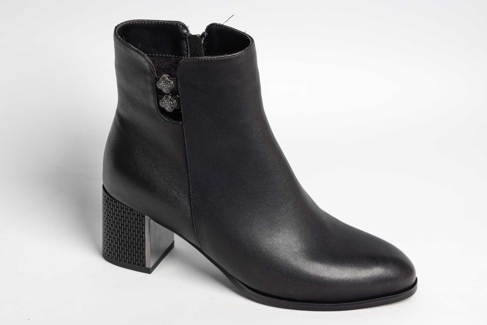 Ghete JOSE SIMON de dama din piele naturala impermeabila prevazuta cu fermoar lateral , blanita pe interior si un toc patrat accesorizat cu insertie decorativa . Greutatea unei singure ghete este de 305 grame.