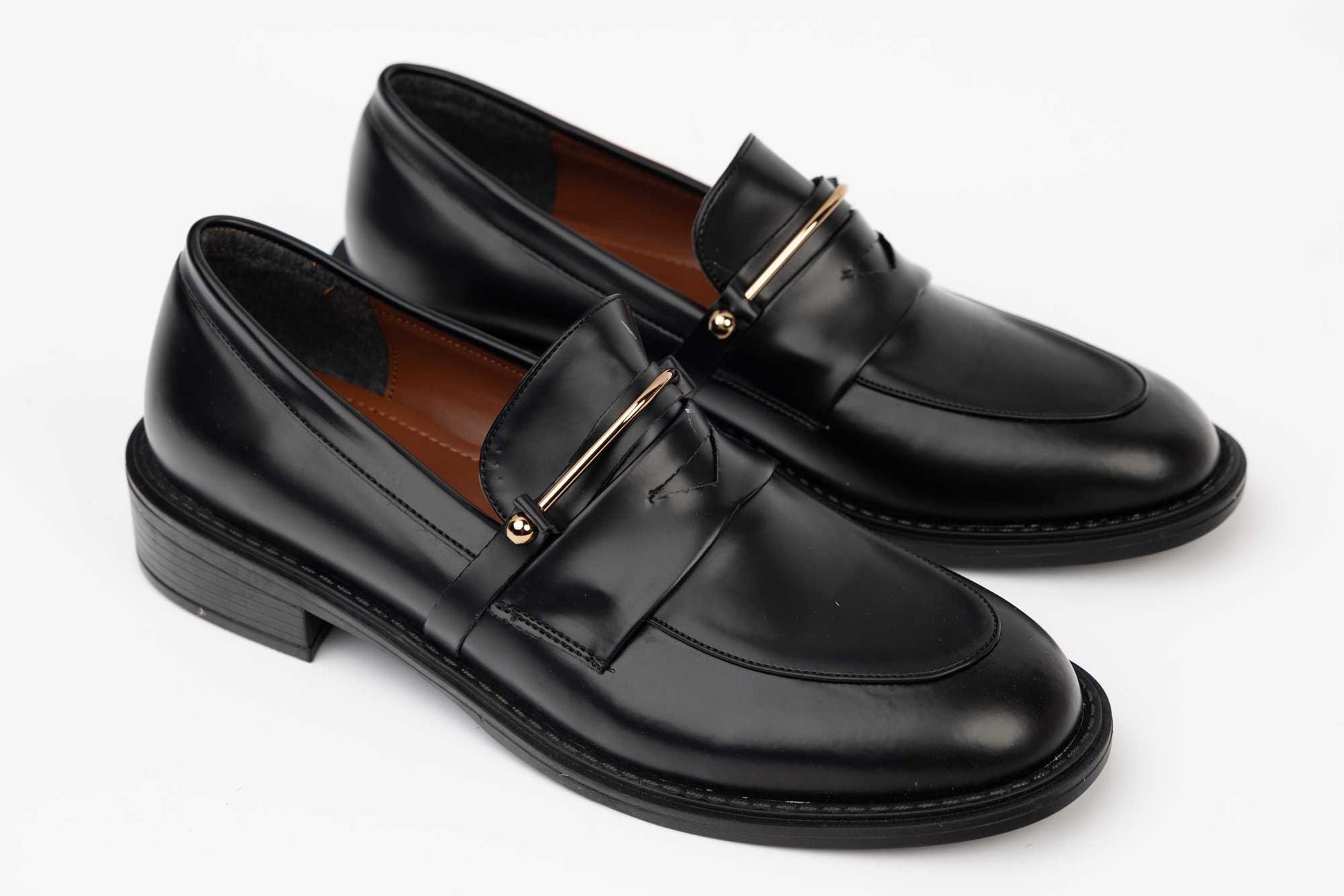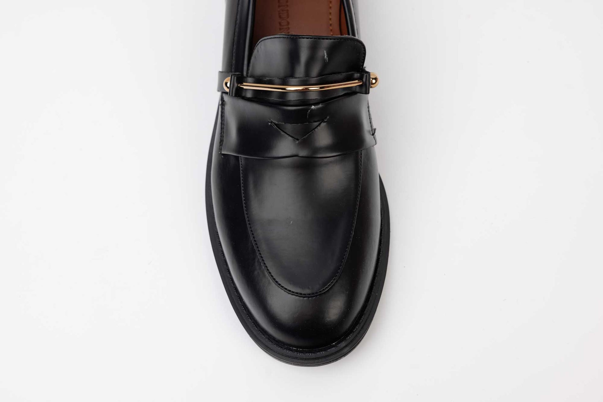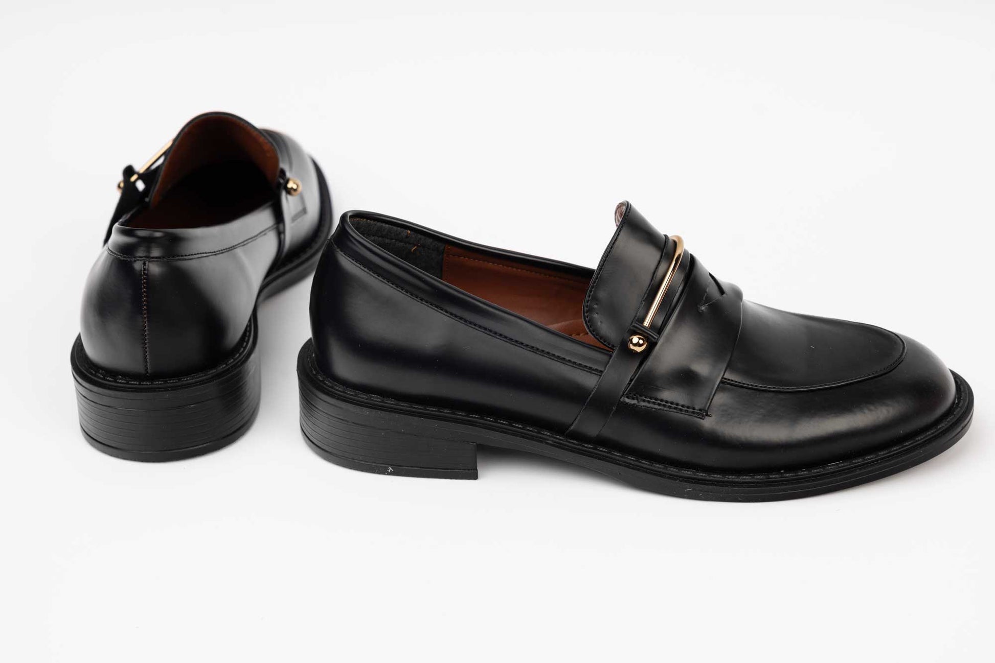Pantofi LONDON de dama din piele eco premium fara siret si talpa groasa de 1 cm avand inserat un accesoriu auriu in partea superioara. Greutatea unui singur picior este de 110 grame si se clasifica in gama pantofilor confort si foate usori.