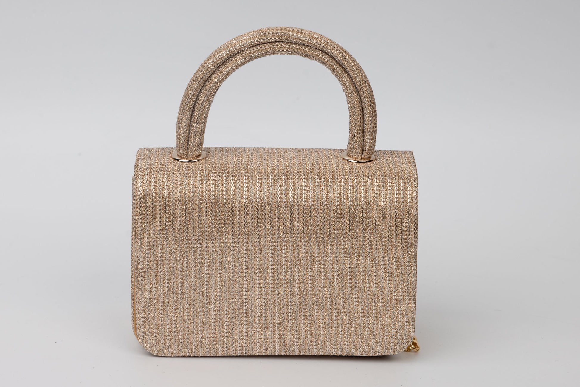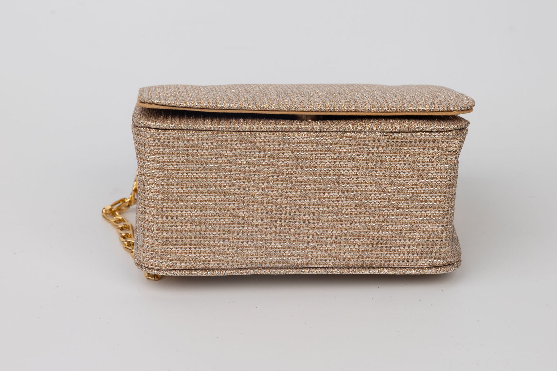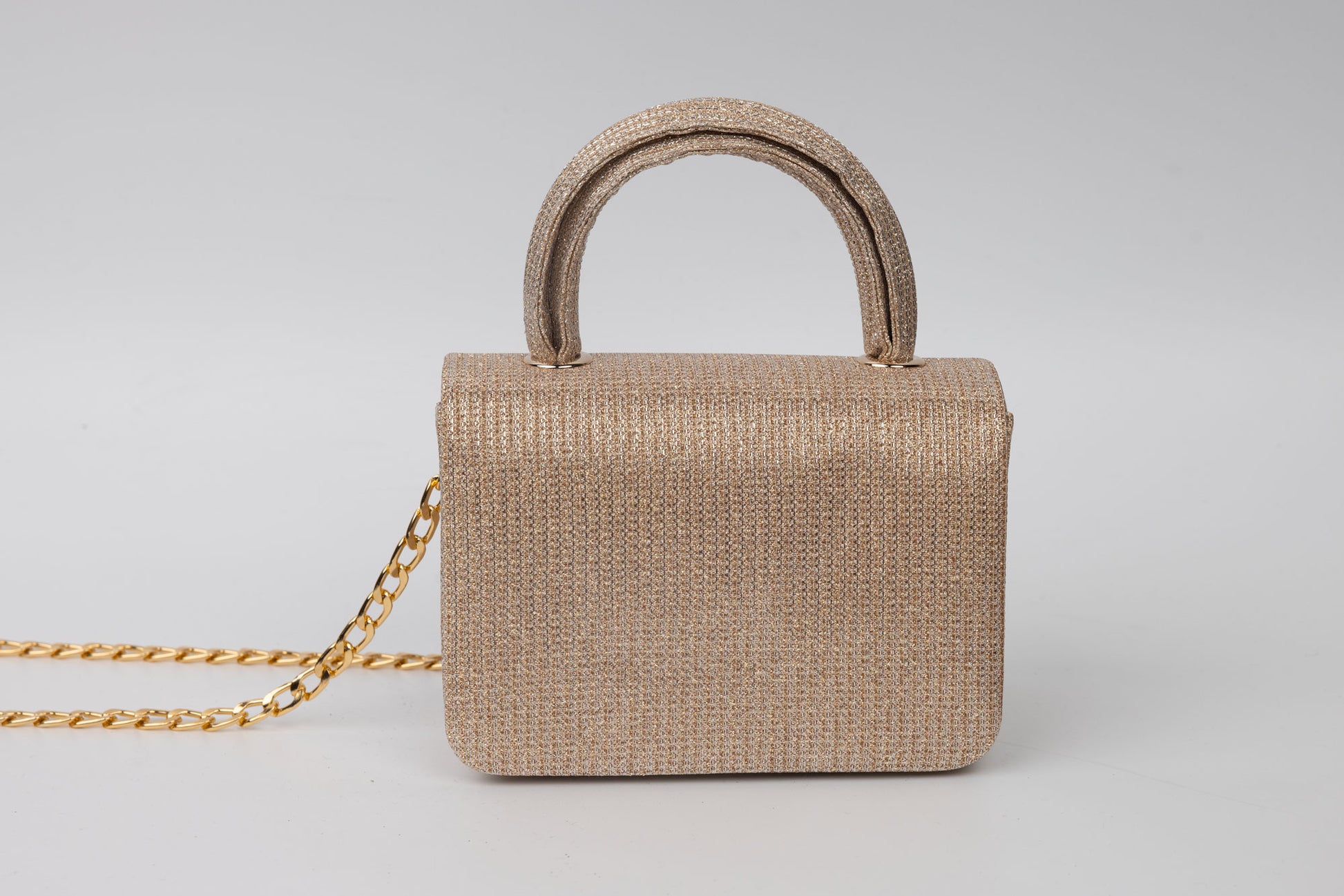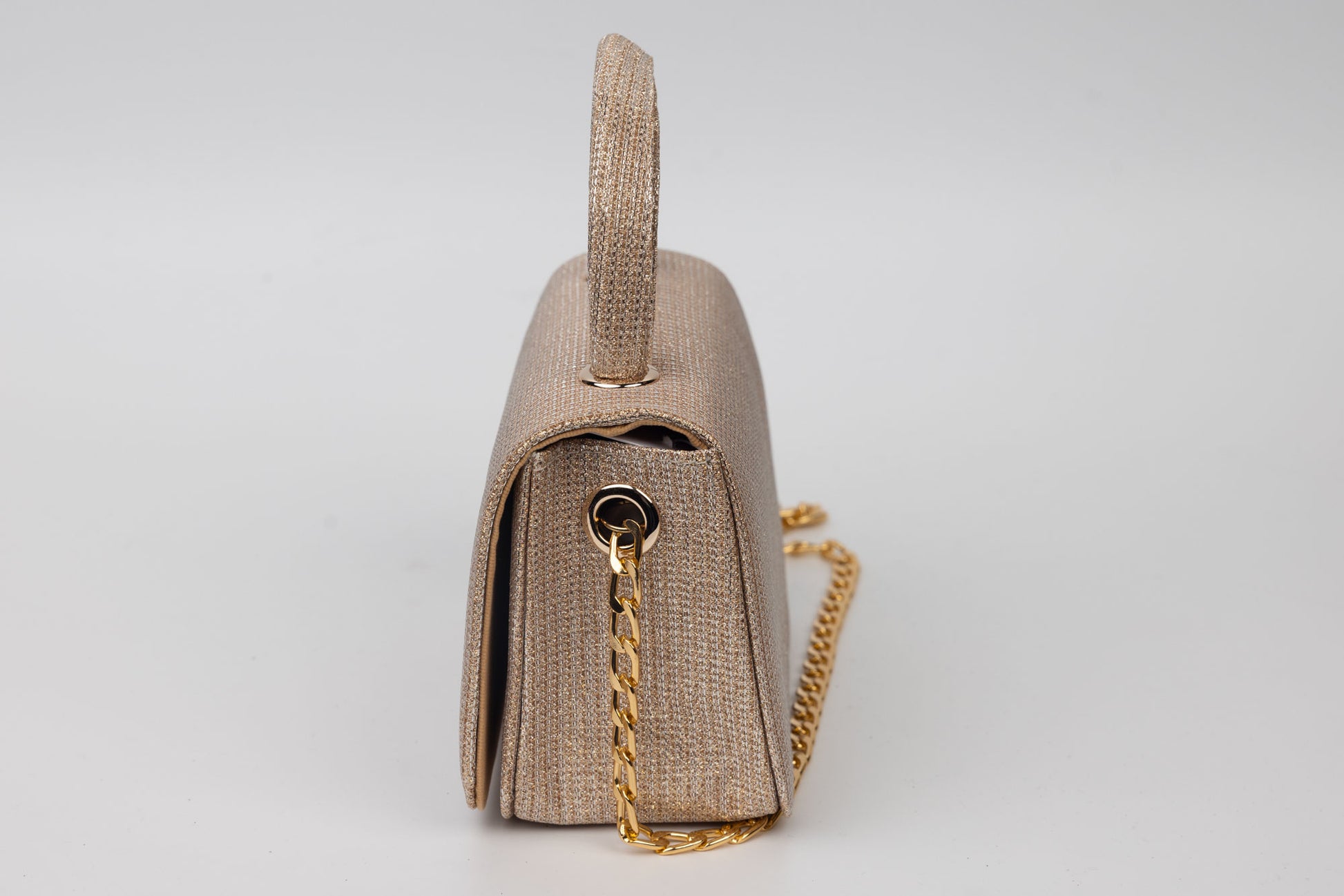 Poseta de dama de marime 18-11 cm din material auriu avand in dotare un maner si o curelusa lant metalica detasabila. Interiorul este unicameral si este potrivit si incapator pentru un telefon sau cosmetice. Inchiderea se face cu o clapeta metalica in partea de sus a plicului.