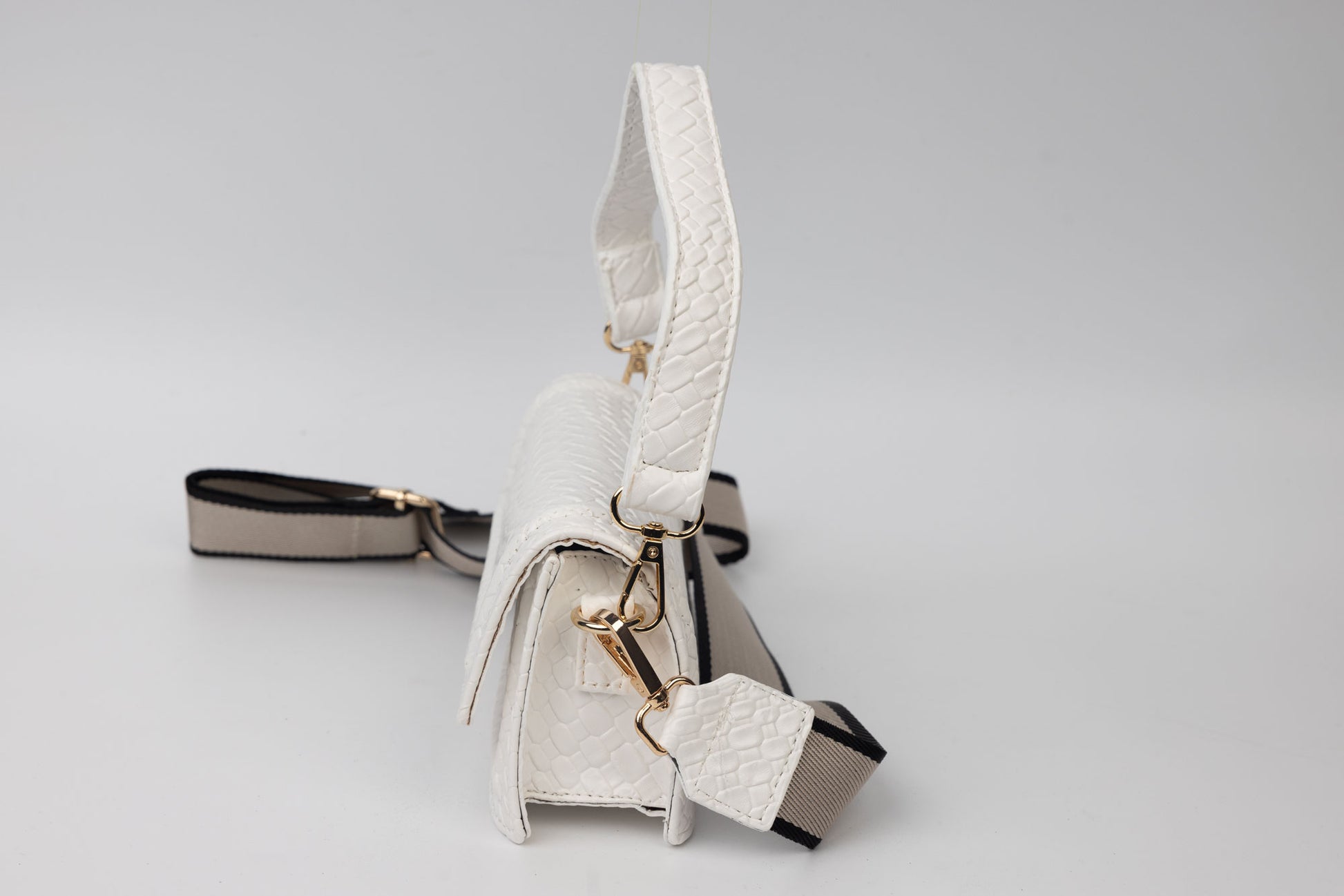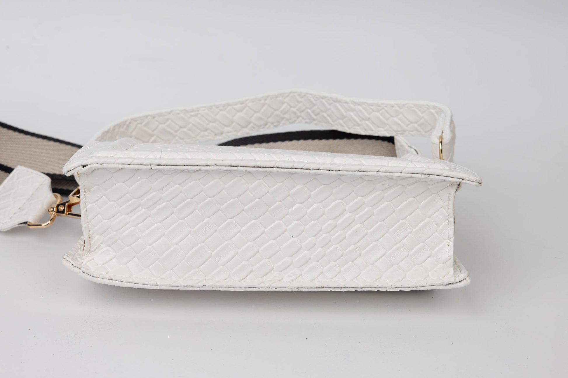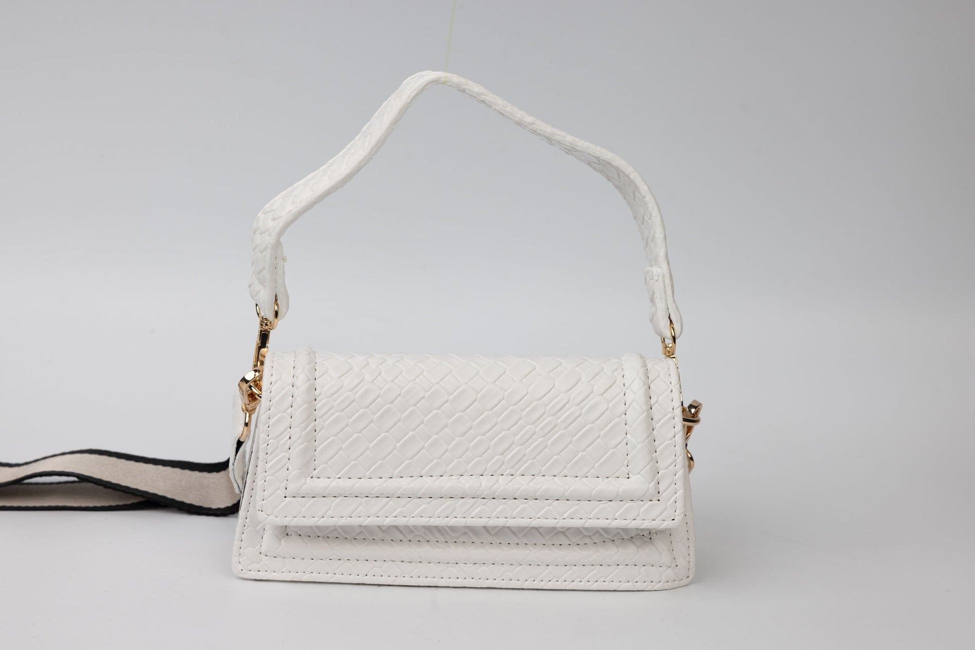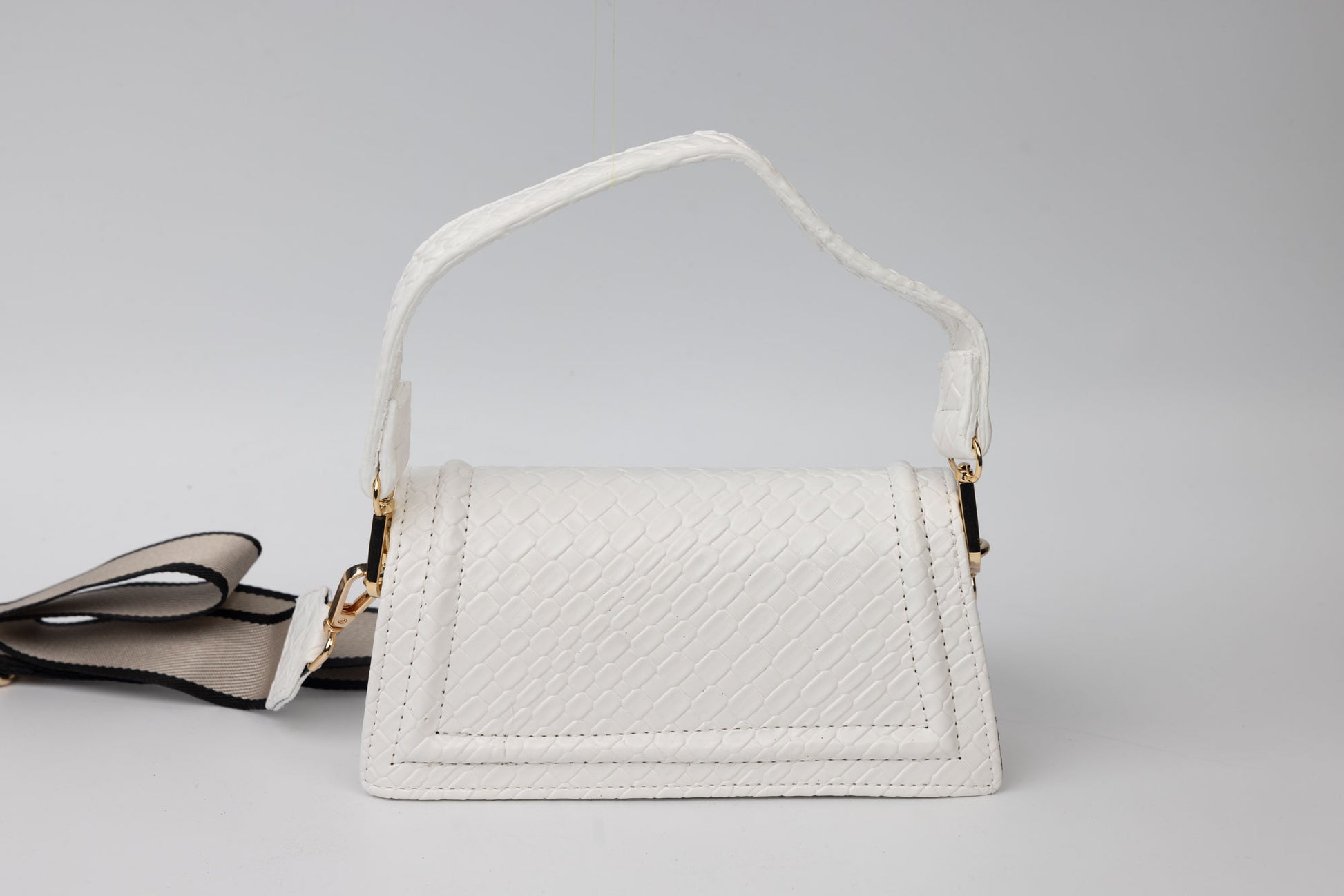 Poseta dama de marime 21-13 cm avand in dotare un maner si o curelusa detasabila . Interiorul este unicameral si este potrivit si incapator pentru un telefon si cosmetice. Inchiderea se face cu o clapeta metalica in partea din fata a posetei.