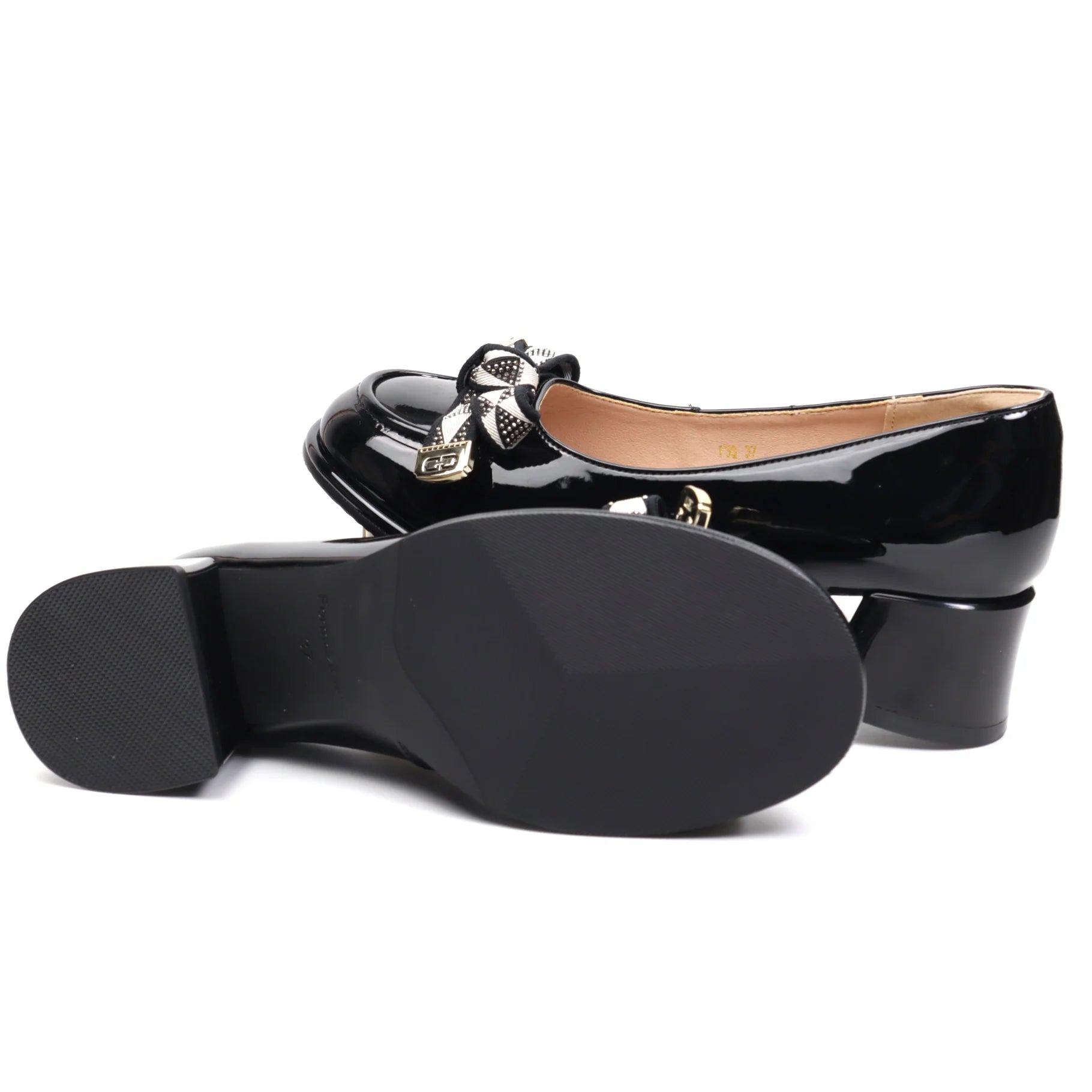 Pantofi FORMAZIONE de dama din piele naturala lacuita cu toc patrat lucios, accesorizat cu o fundita.Pielea este foarte moale si ofera maximum de confort la purtare indelungata, Talpa este usoara, flexibila iar pe interior detine un brant cu memory.