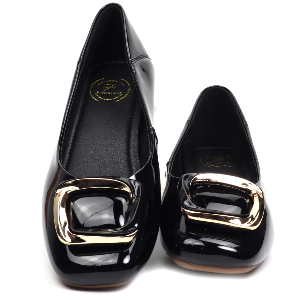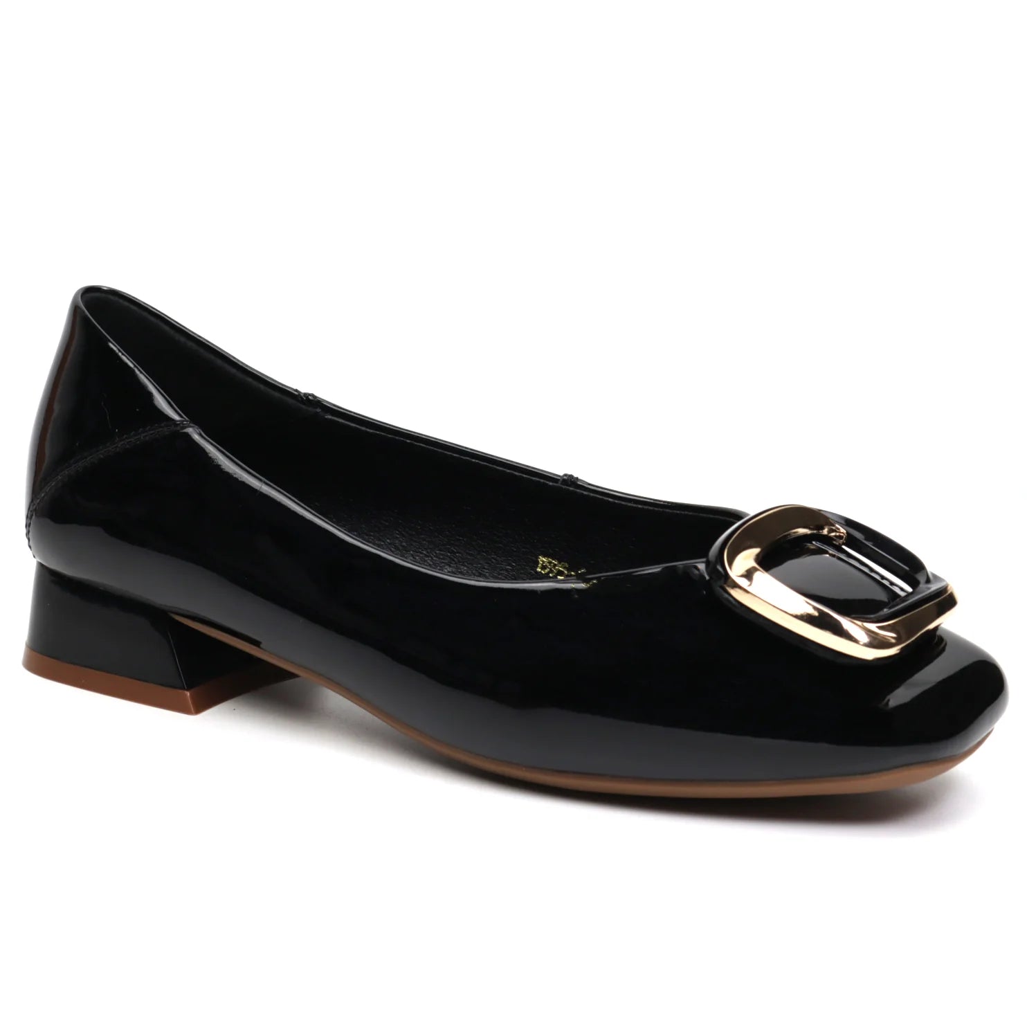 Pantofi FORMAZIONE de dama din piele naturala lacuita ( gen balerin) cu toc patrat de 1 cm inaltime si e accesorizat pe varf . Pielea este foarte moale si ofera maximum de confort la purtare indelungata, Talpa este usoara, flexibila iar pe interior detine un brant cu memory. Greutatea unui singur pantof este de 210 grame.