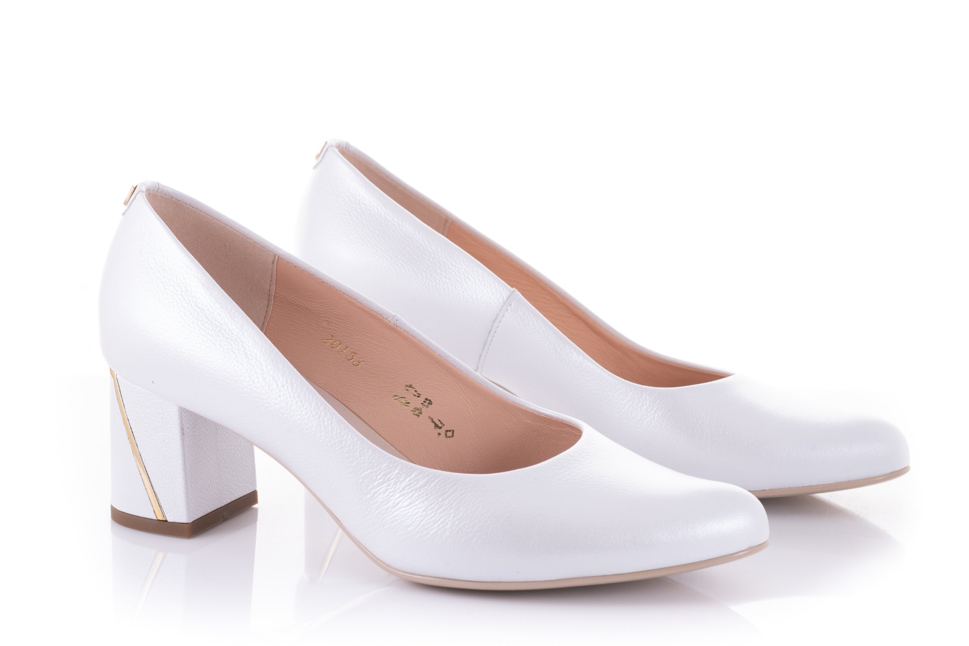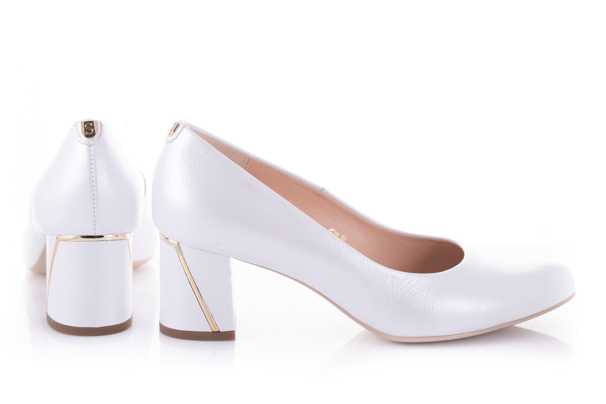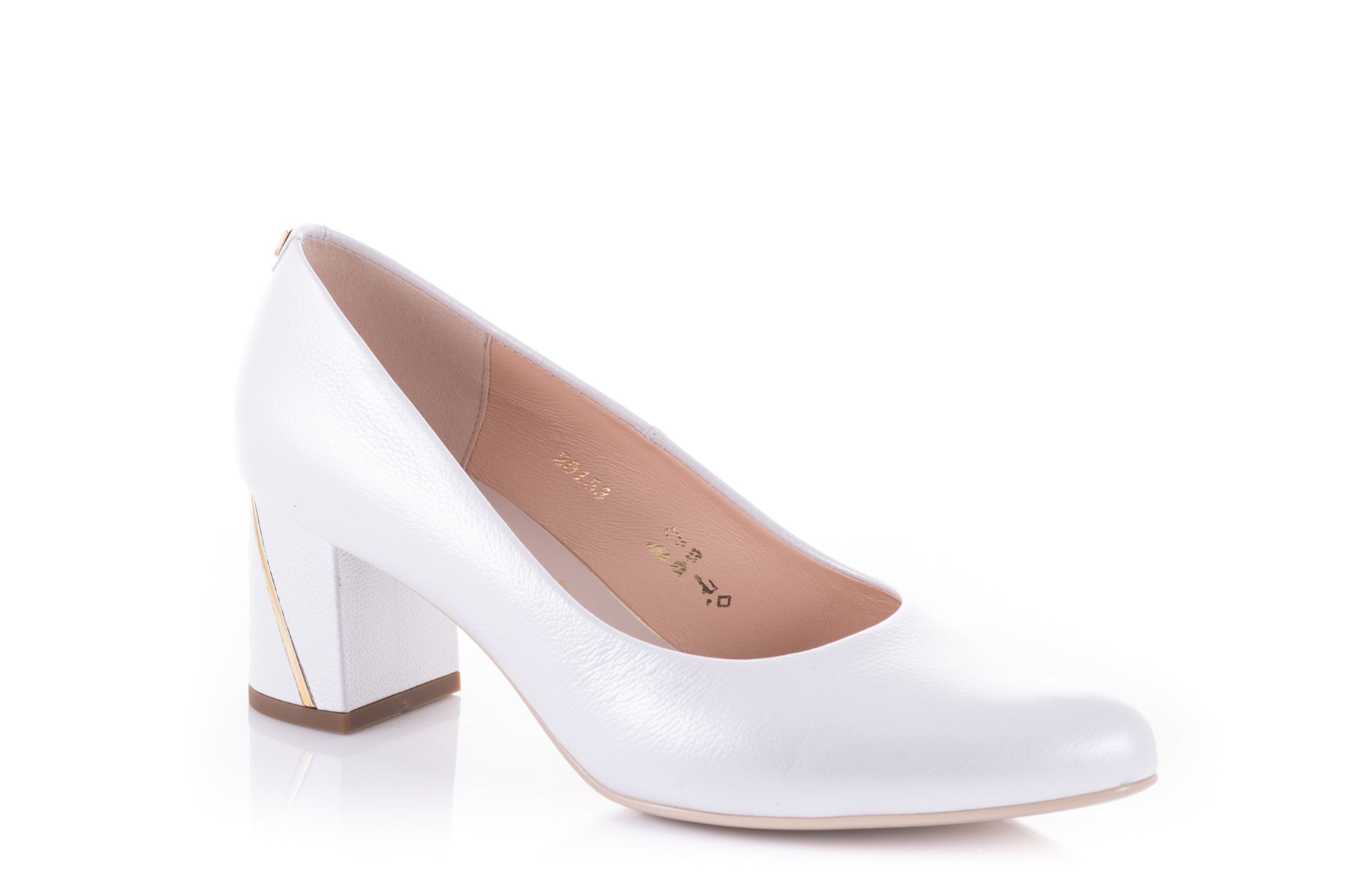 Pantofi mireasa SALA cu toc mediu patrat,model clasic si simplu confectionat din piele naturala de vitel moale la atingere, ofera un confort sporit datorita calapodului testat. Usor de purtat , acest model are inaltimea tocului de 5 cm iar pe toc are un accesoriu finut auriu.