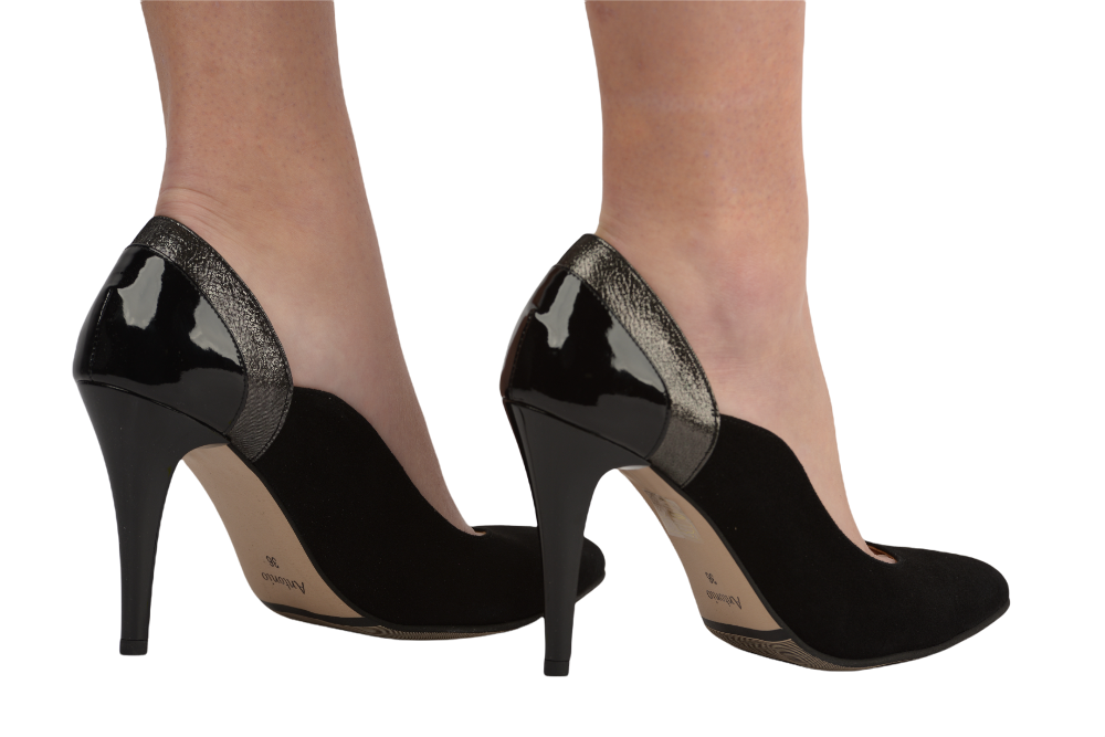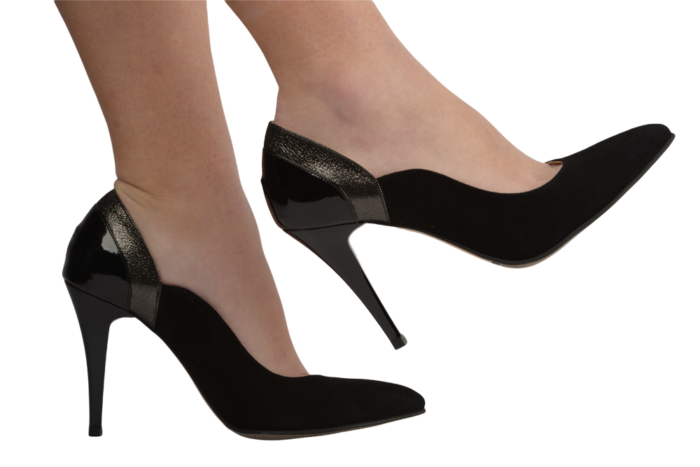Pantofi ANTONIO de dama simplu din piele intoarsa naturala simplu si clasic, combinat cu piele lacuita cu toc stiletto de 10 cm inaltime cu varful ascutit . Greutatea unui singur picior este de 195 grame.