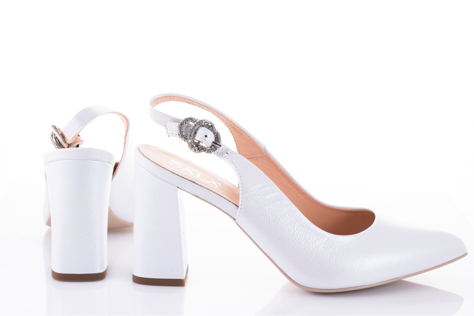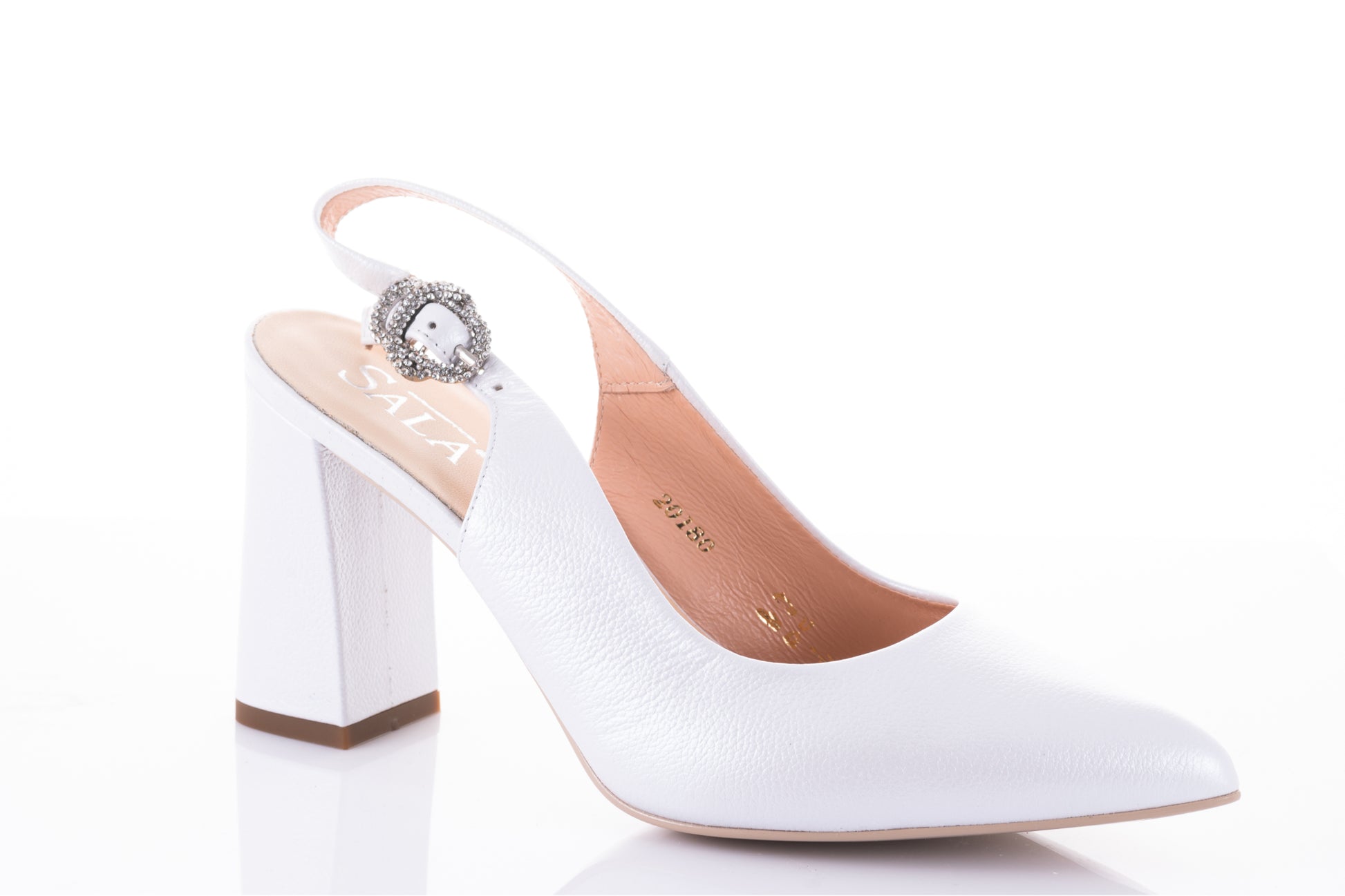 Pantof mireasa SALA cu toc mediu patrat,model clasic si simplu confectionat din piele naturala de vitel moale la atingere, ofera un confort sporit datorita calapodului testat. Usor de purtat , acest model are inaltimea tocului de 7 cm iar catarama de pe bareta laterala de prindere este accesorizata cu cristale deosebite. Greutatea unui singur picior este de 214 grame.