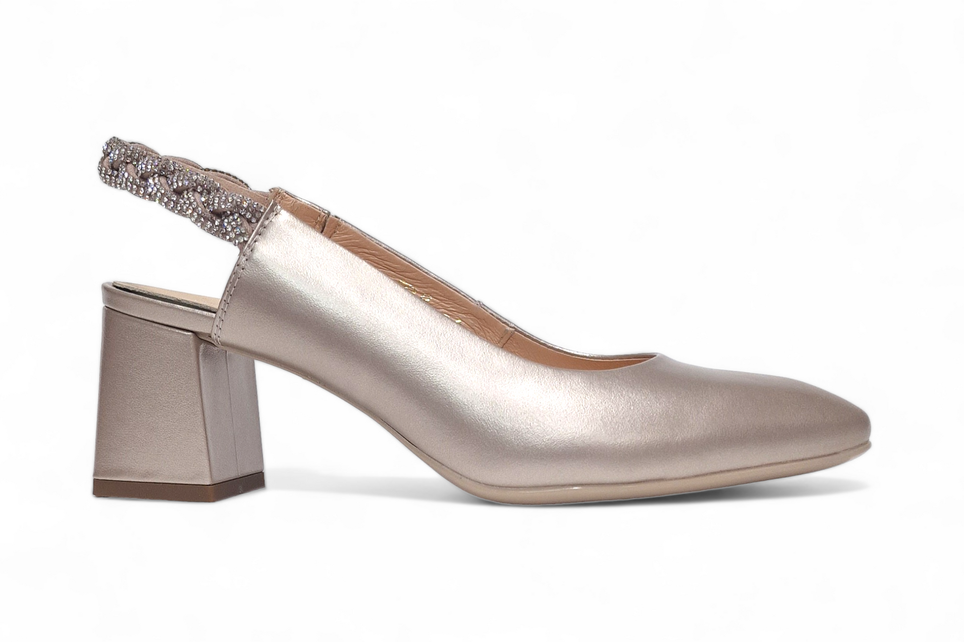 Pantof SALA cu toc mediu patrat,model clasic si simplu confectionat din piele naturala de vitel moale la atingere, ofera un confort sporit datorita calapodului testat la care am accesorizat un toc usor de purtat (5 cm). Acest model are in zona calcaiului o bareta elastica accesorizata cu cristale.