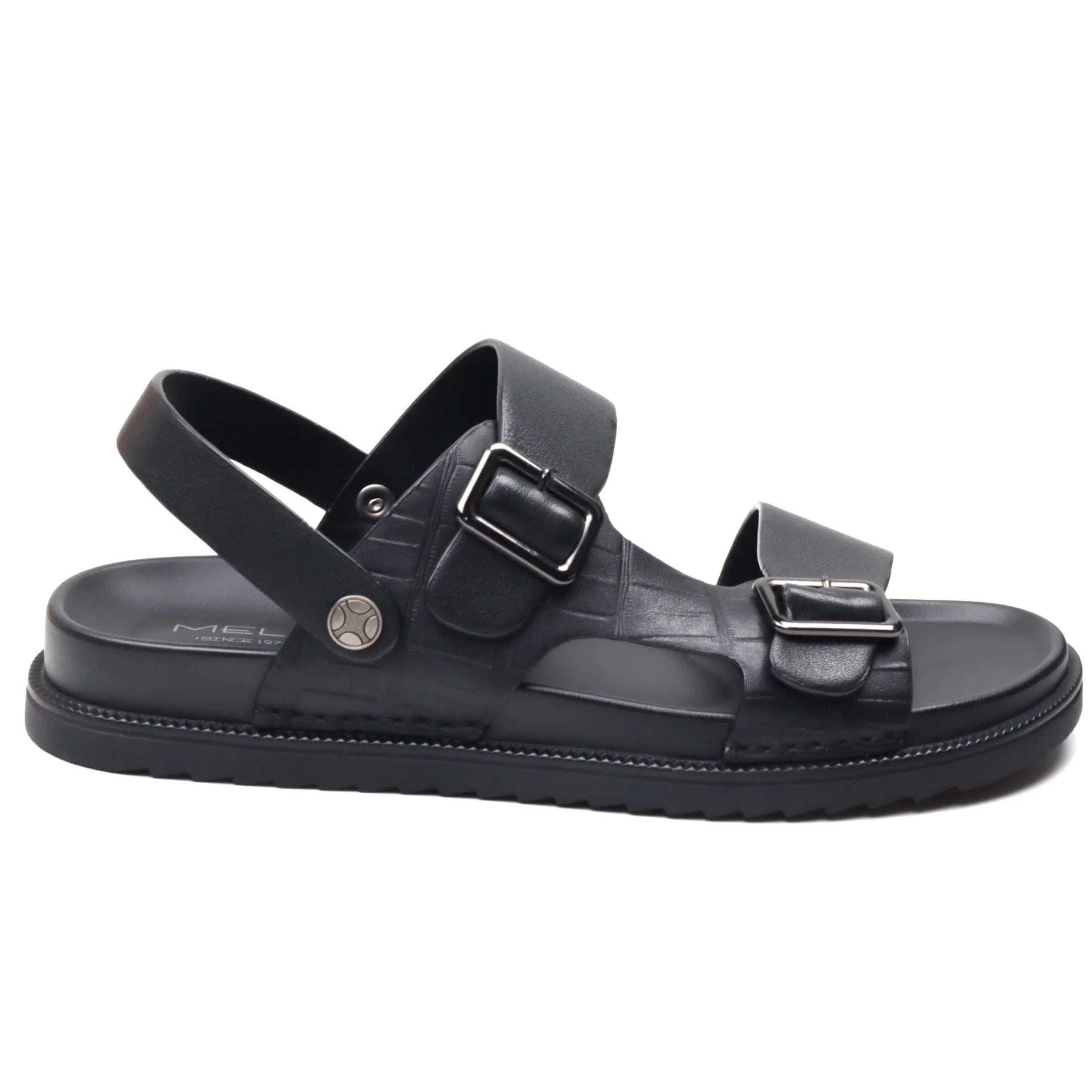Sandale MELS de barbati din piele naturala interior si exterior cu o talpa foarte moale si elastica la care se adauga un brant memory special . Prinderea se face cu o bareta elastica in partea din spate (la calcai) dar se poate purta si gen slap daca bareta se muta pe ristul piciorului, bareta fiind mobila. Greutatea unui singur picior este 320 grame.