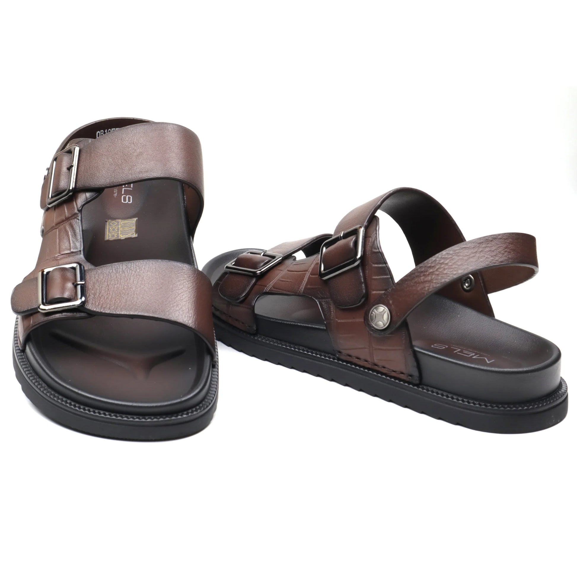 Sandale MELS de barbati din piele naturala interior si exterior cu o talpa foarte moale si elastica la care se adauga un brant memory special . Prinderea se face cu o bareta elastica in partea din spate (la calcai) dar se poate purta si gen slap daca bareta se muta pe ristul piciorului, bareta fiind mobila. Greutatea unui singur picior este 320 grame.