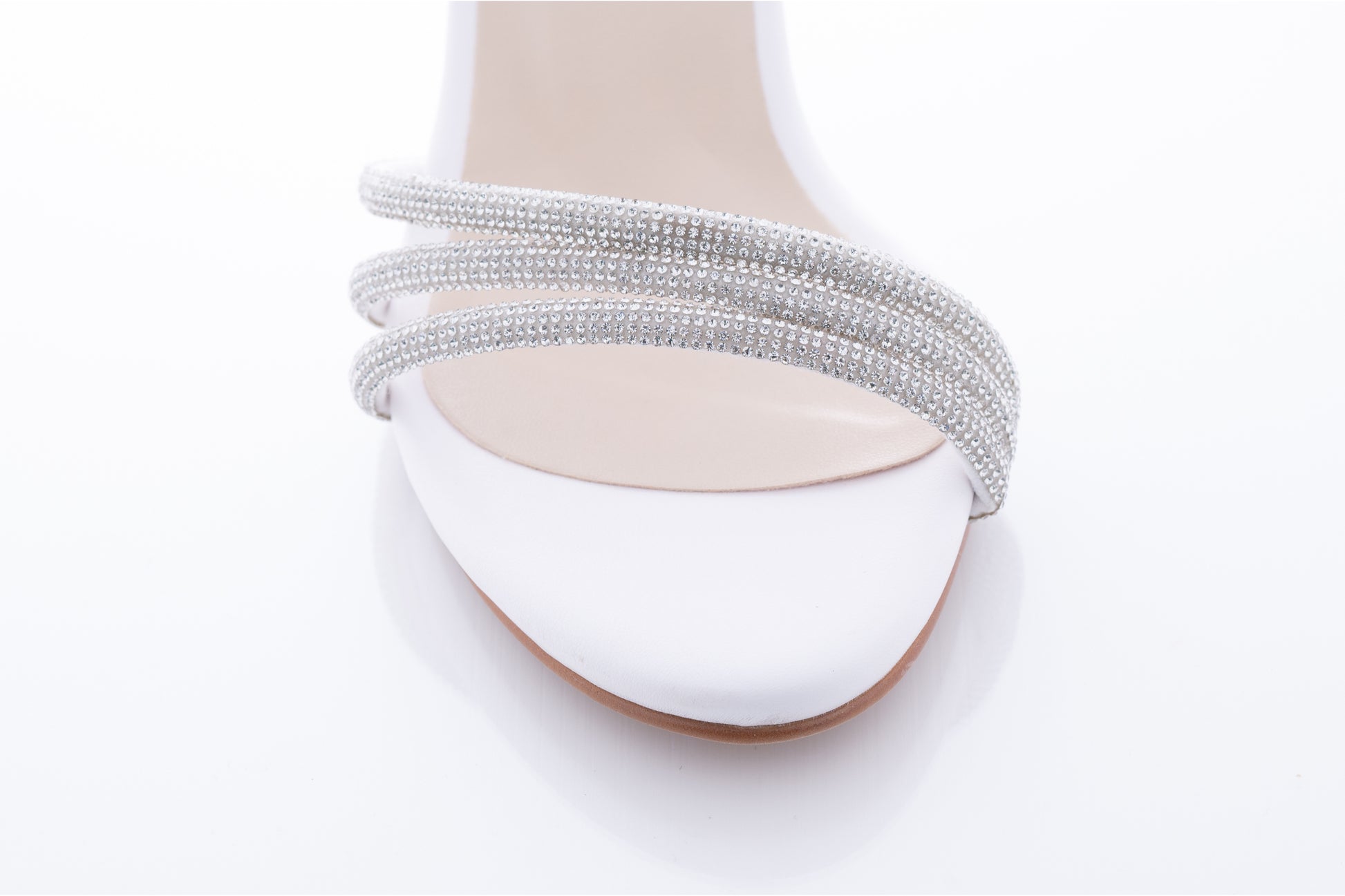 Sandale mireasa KARIN din piele ecologica de calitate premium avand un toc subtire evazat de 8 cm inaltime. Greutatea unui singur picior este 185 grame. Prinderea se face cu o bareta subtire deasupra gleznei pentru o fixare mai buna a piciorului. Partea din fata este alcatuita din 3 barete cu cristale care face aceasta sandala sa fie una foarte eleganta, simpla si comoda.