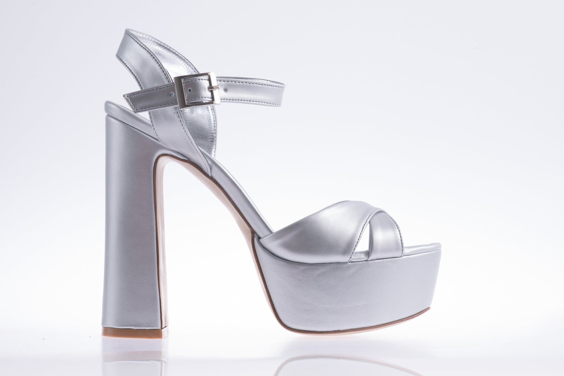 Sandale KARIN de piele ecologica de calitate cu tocul gros de 14 cm inaltime si platforma de 4 cm cu prindere cu o bareta subtire de jur imprejurul gleznei. Greutatea unui singur pantof este de 314 grame.