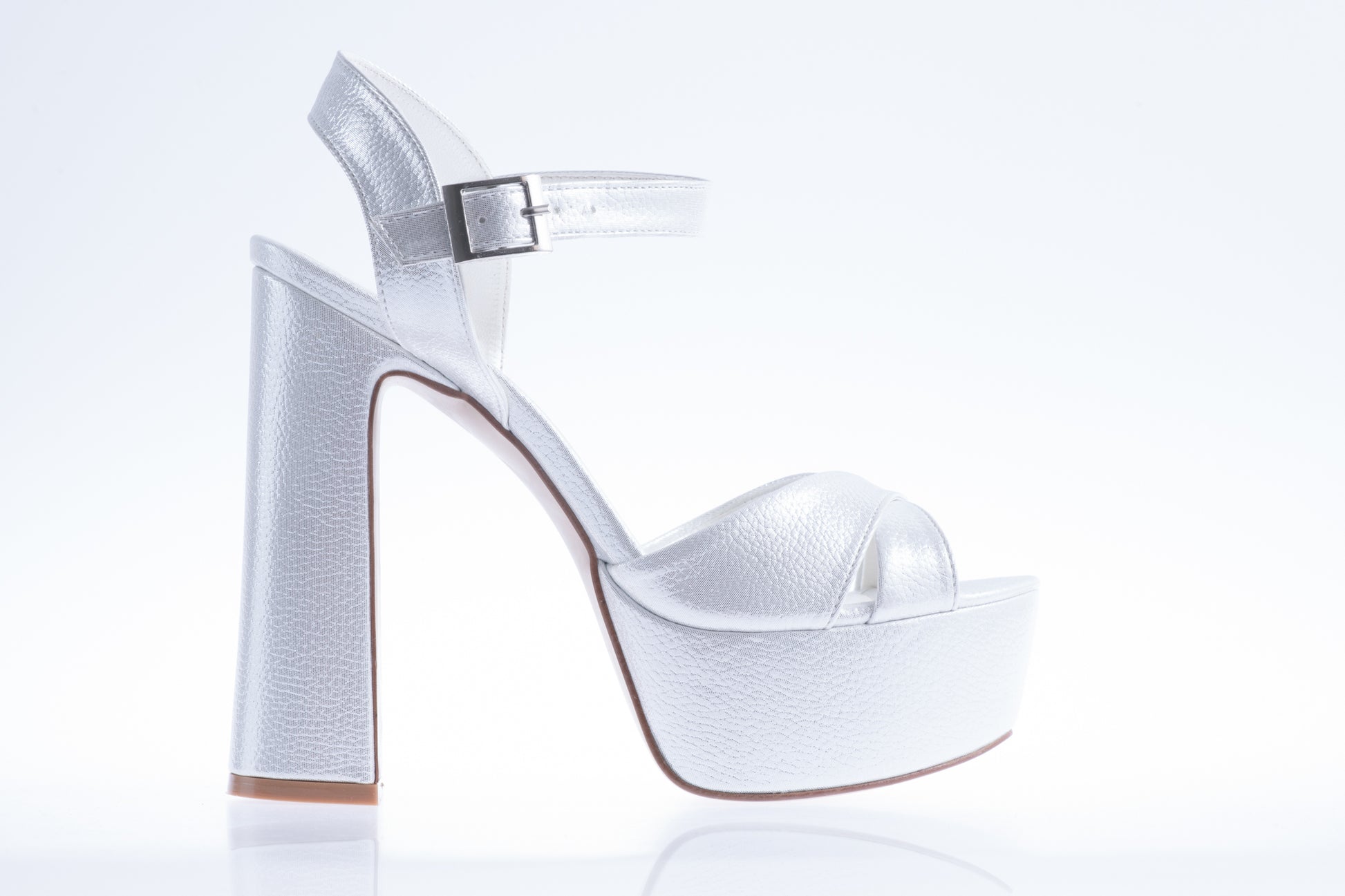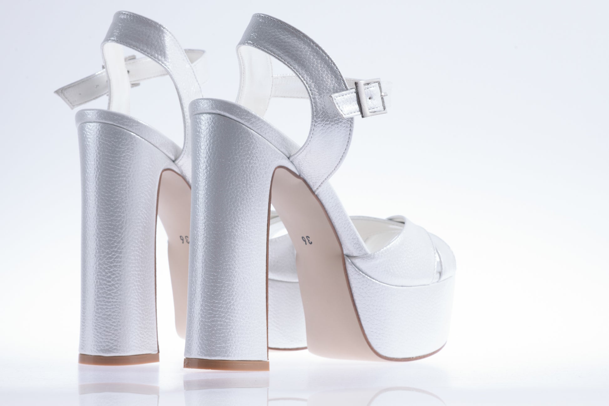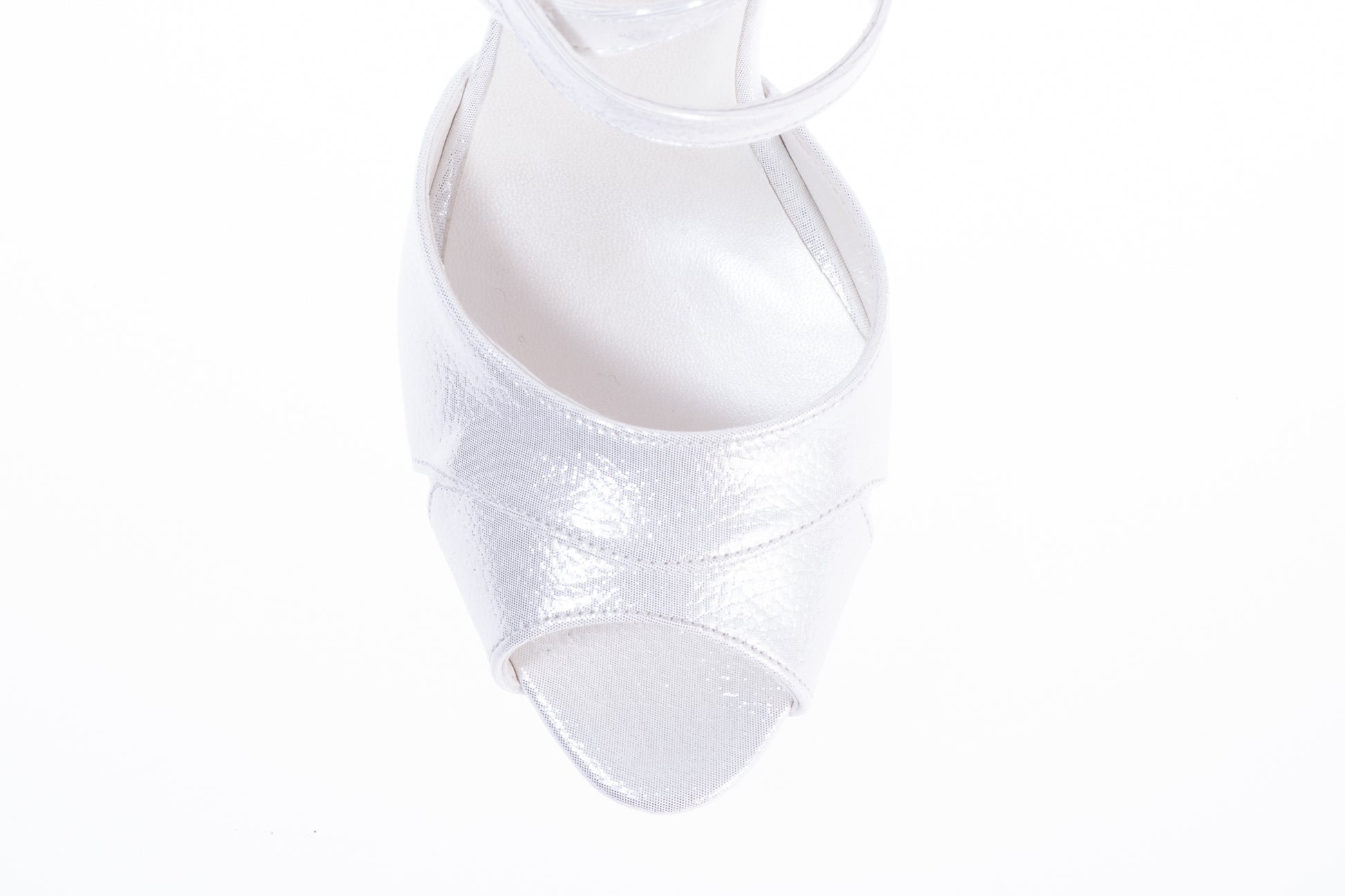 Sandale mireasa KARIN de piele ecologica de calitate premium cu tocul gros de 14 cm inaltime si platforma de 4 cm cu prindere cu o bareta subtire de jur imprejurul gleznei. Greutatea unui singur pantof este de 314 grame.
