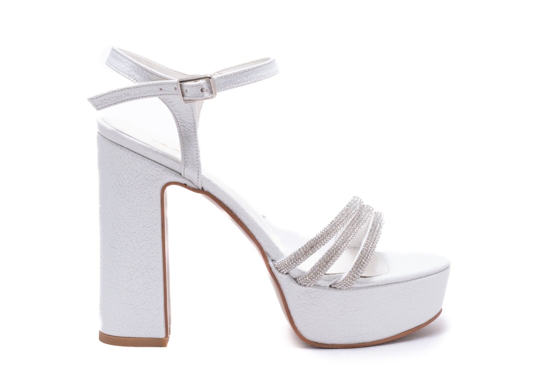Sandale mireasa KARIN din piele ecologica de calitate premium avand un toc gros de 11 cm inaltime. Greutatea unui singur picior este 264 grame. Prinderea se face cu o bareta subtire deasupra gleznei pentru o fixare mai buna a piciorului. Partea din fata este alcatuita din 3 barete cu cristale care face aceasta sandala sa fie una foarte eleganta si comoda.