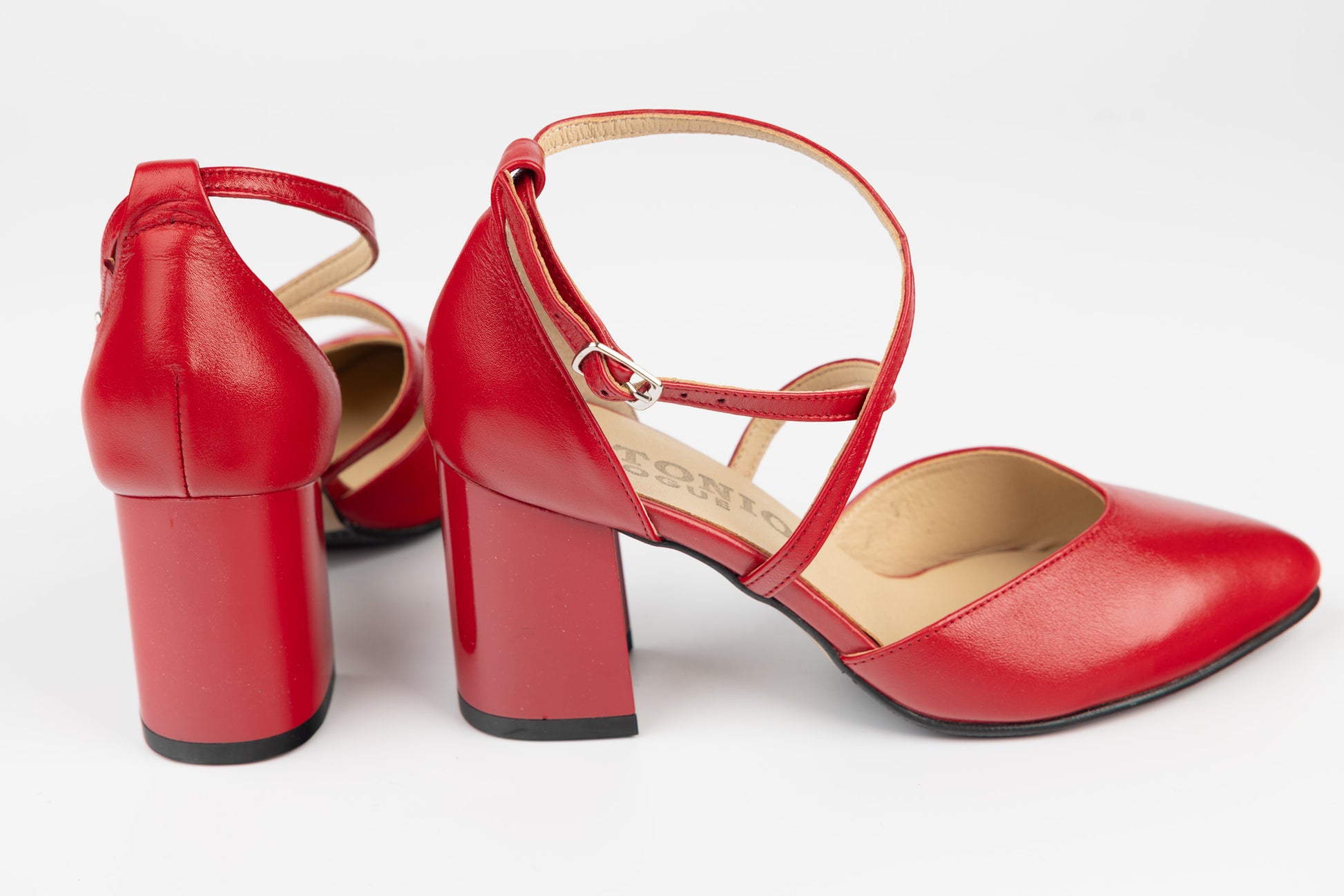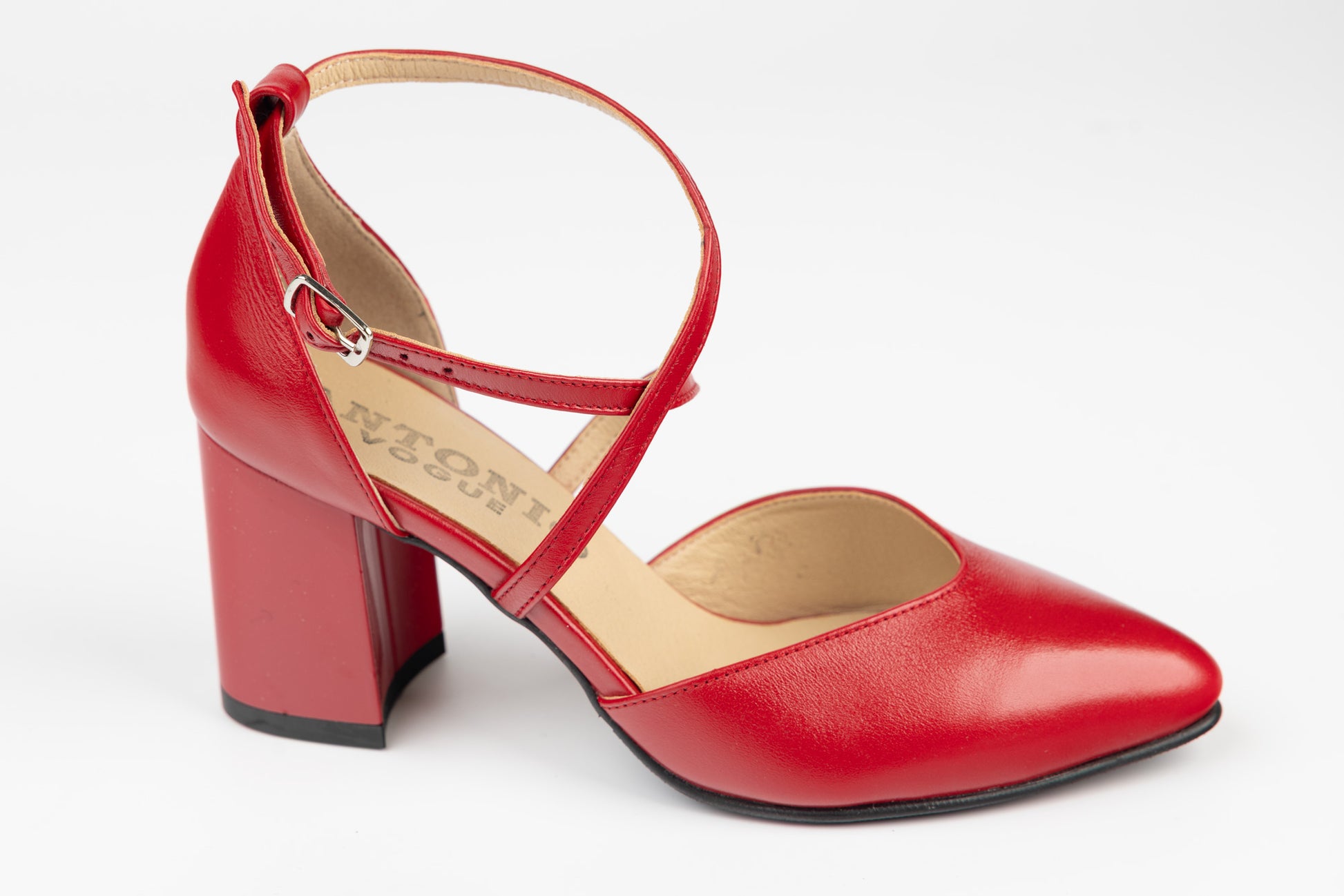 Pantofi ANTONIO de dama decupati din piele naturala cu prindere deasupra gleznei cu o bareta din piele avand tocul patrat de 6 cm. Greutatea unui singur picior este de 240 grame. Recomandat pentru doamne cu picior mai lat sau cu mont.
